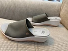 Excellent condition. Elevate your summer footwear game with these green Clarks Cloudsteppers Step Cali Bay slide sandals. The cushioned foam insole and soft fabric lining provide maximum comfort and support, while the rubber outsole ensures non-slip traction. These sandals have a mid wedge heel that gives a comfortable lift, perfect for casual wear or travel. The breathable mesh upper material and logo accents add a stylish touch to these versatile sandals. Available in size 10 with medium width, these Clarks Cloudsteppers are a must-have addition to your shoe collection.