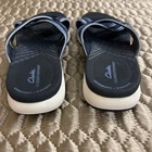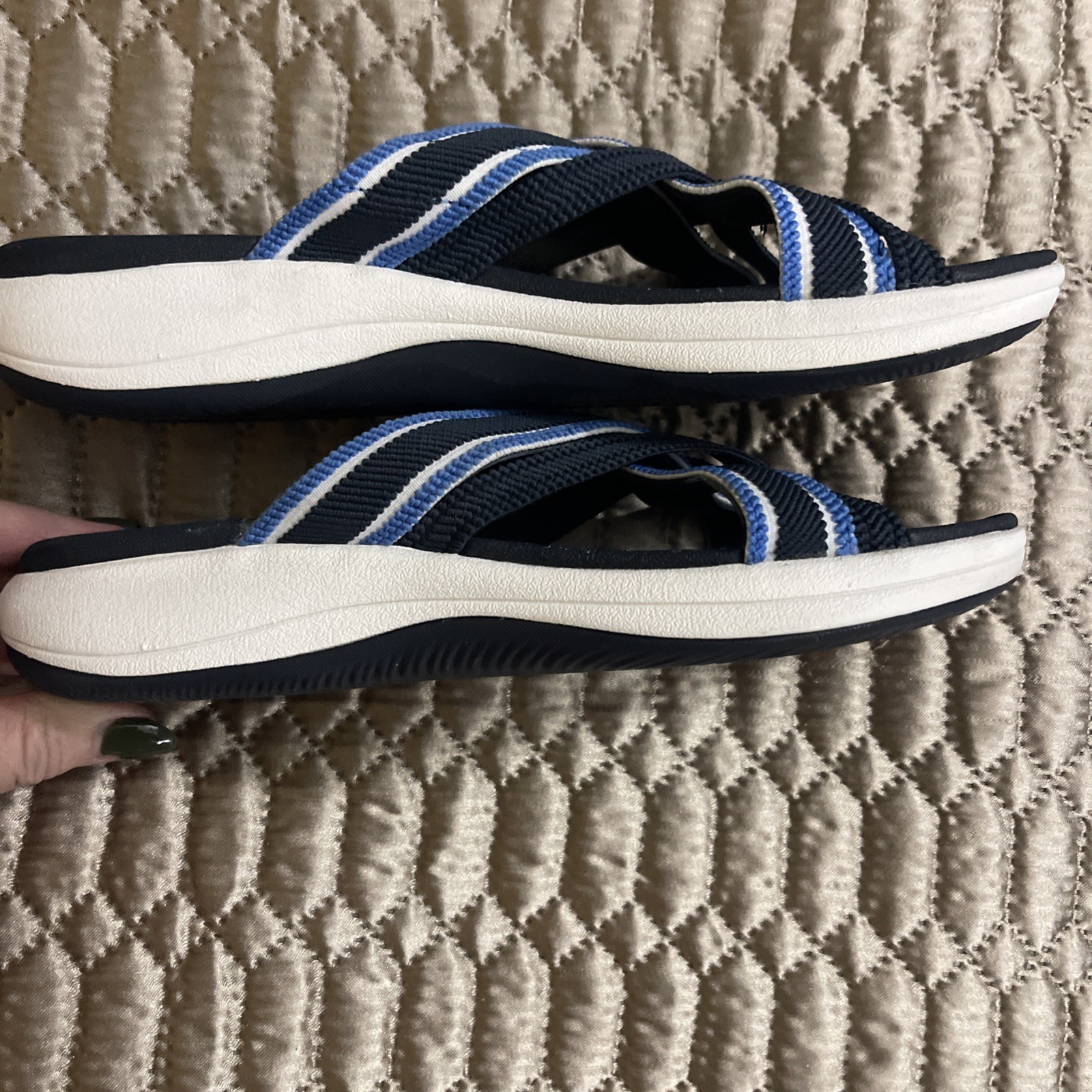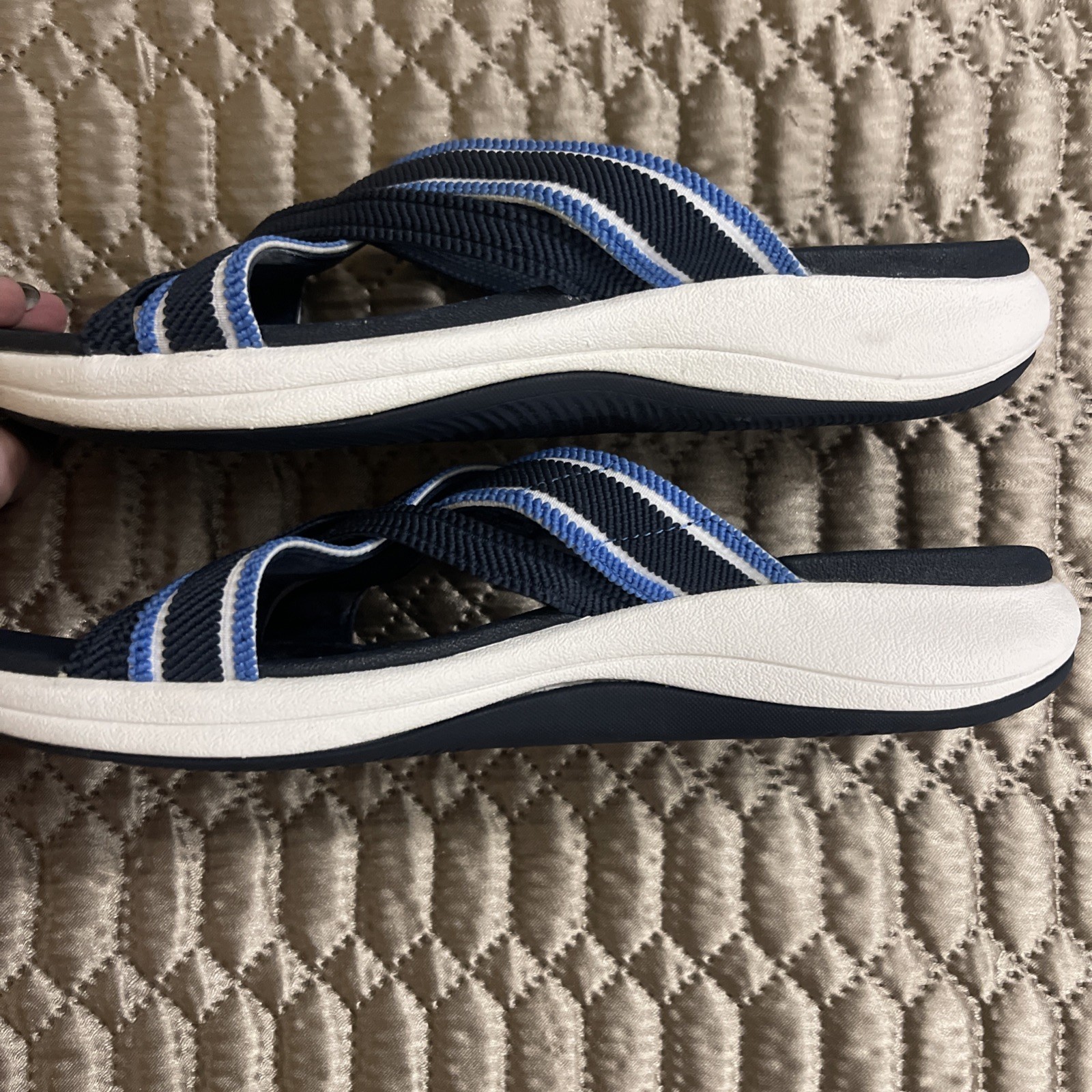 The Clarks Cloudsteppers Women's Size 8.5 Navy Blue sandals are a stylish and comfortable choice for casual occasions during the summer and spring seasons. With a low heel height and flat heel style, these slip-on sandals feature a rubber outsole for durability and easy traction. The navy blue color and solid pattern make them versatile for various outfits, while the logo accents add a touch of detail. Made with synthetic upper material and designed with comfort in mind, these Clarks Cloudsteppers are a practical and fashionable option for women seeking both style and functionality in their footwear.