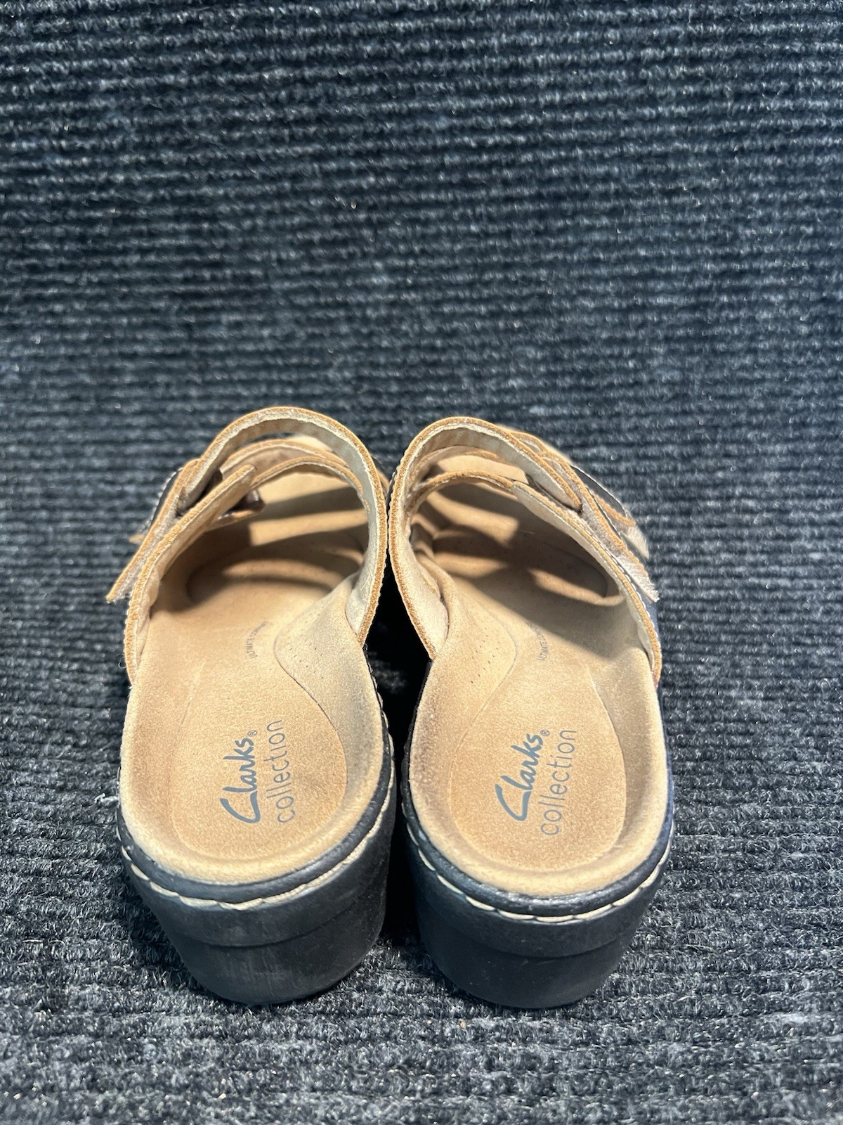 The Clarks Collection Merliah Karli Women's Slip-On Sandals in size 8.5 are a stylish and comfortable option for casual occasions. Made of leather with a metallic finish, these sandals feature a solid pattern and a wedge heel for added height. The slip-on style and adjustable strap provide easy wear and a secure fit, while the arch support and breathable design ensure all-day comfort. Ideal for summer and spring, these sandals are a versatile addition to any woman's shoe collection.