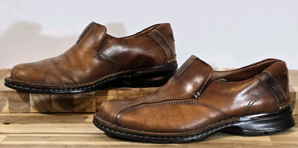Clarks Escalade Men's Brown Leather Slip-On Loafers - Size 8M Step into comfort and style with these classic Clarks Escalade brown leather slip-on loafers. Known for their exceptional comfort and quality construction, these versatile shoes are perfect for both casual and business casual occasions. **Key Features:** • Brand: Clarks • Model: Escalade • Size: 8M (Medium width) • Material: Genuine leather upper • Color: Rich brown • Sole: Man-made with wave-pattern tread for traction • Slip-on design with elastic side gores • Cushioned footbed for all-day comfort • Decorative stitching detail **Condition:** Pre-owned with normal wear. The leather uppers show light creasing and minor scuffs consistent with use. Soles show moderate wear but have good tread remaining. Interior shows normal wear patterns. These timeless loafers feature Clarks' signature comfort technology and classic styling that pairs well with khakis, jeans, or dress pants. The slip-on design makes them convenient for everyday wear.