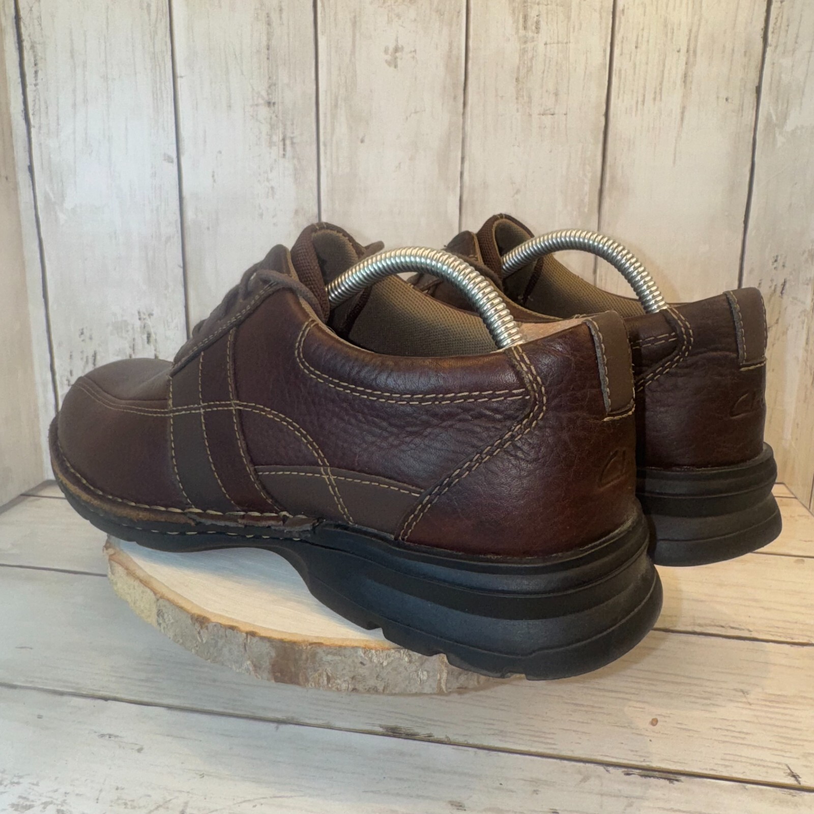 The Clarks Espace Oiled Brown Leather Derby Oxford Shoes are a stylish and versatile option for men's everyday wear. Made with high-quality leather and featuring a solid brown color, these lace-up shoes have a classic round toe shape and a durable rubber outsole. Perfect for travel, casual outings, or workwear, these shoes offer comfort and cushioning with a fabric lining and insole. The Clarks brand logo adds a touch of sophistication to this timeless Oxford style shoe, making them a great choice for any man looking for both fashion and function in his footwear.