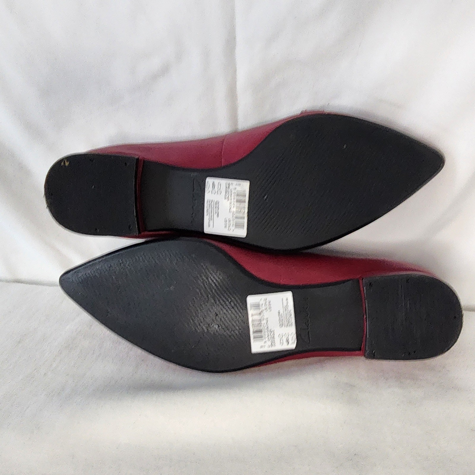 A pair of Clarks loafers, designed for both style and comfort. These shoes feature a sleek, pointed-toe silhouette, complemented by a decorative buckle accent across the vamp, adding a touch of sophistication. The low heel provides subtle elevation, while the leather upper ensures durability and a refined look. These loafers are a versatile addition to any wardrobe, suitable for both professional and casual settings. Model: Clarks Laina 15 Buckle Keywords: Clarks, loafers, leather loafers, pointed toe, dress shoes, wine red, buckle loafers, womens shoes, flats, classic loafers, comfortable loafers, casual shoes, work shoes, office shoes, slip on shoes Clean and in like new condition, sanitized before shipping. From a smoke-free home.