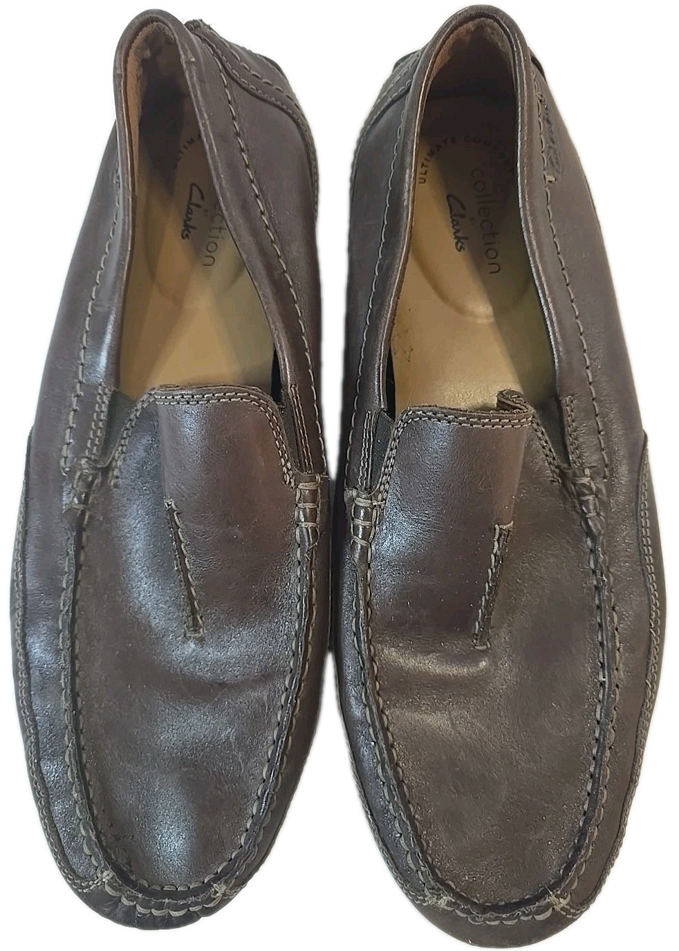 Pre-owned in very good condition Clark's Men's Ultimate Comfort Collection Dark Brown Slip-On Loafers in size 9.5 (UK 8.5, EU 42 1/2). These loafers are made of leather and feature a slip-on closure for easy wear. The dark brown color and loafer style make them a versatile option for casual wear. With the brand's reputation for comfort and quality, these loafers are a practical and stylish choice for everyday use.