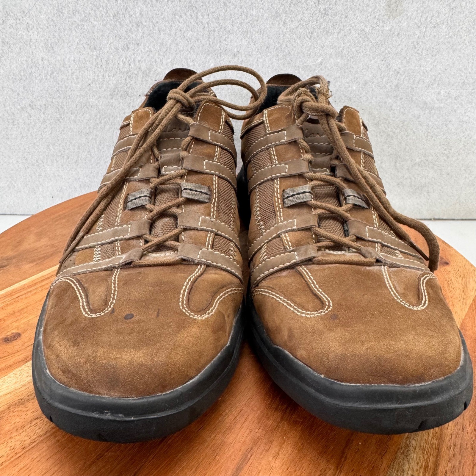 These Clarks walking shoes are incredibly comfortable right out of the box! The leather upper is soft yet durable, and the cushioned insole makes them perfect for all-day wear. The brown color is versatile, easily pairing with jeans or chinos. Despite the minor toe mark (shown in photos), they look great and provide excellent support. The lace-up design ensures a secure fit, while the rubber sole offers good traction. Perfect for casual outings or light walks—definitely worth it!