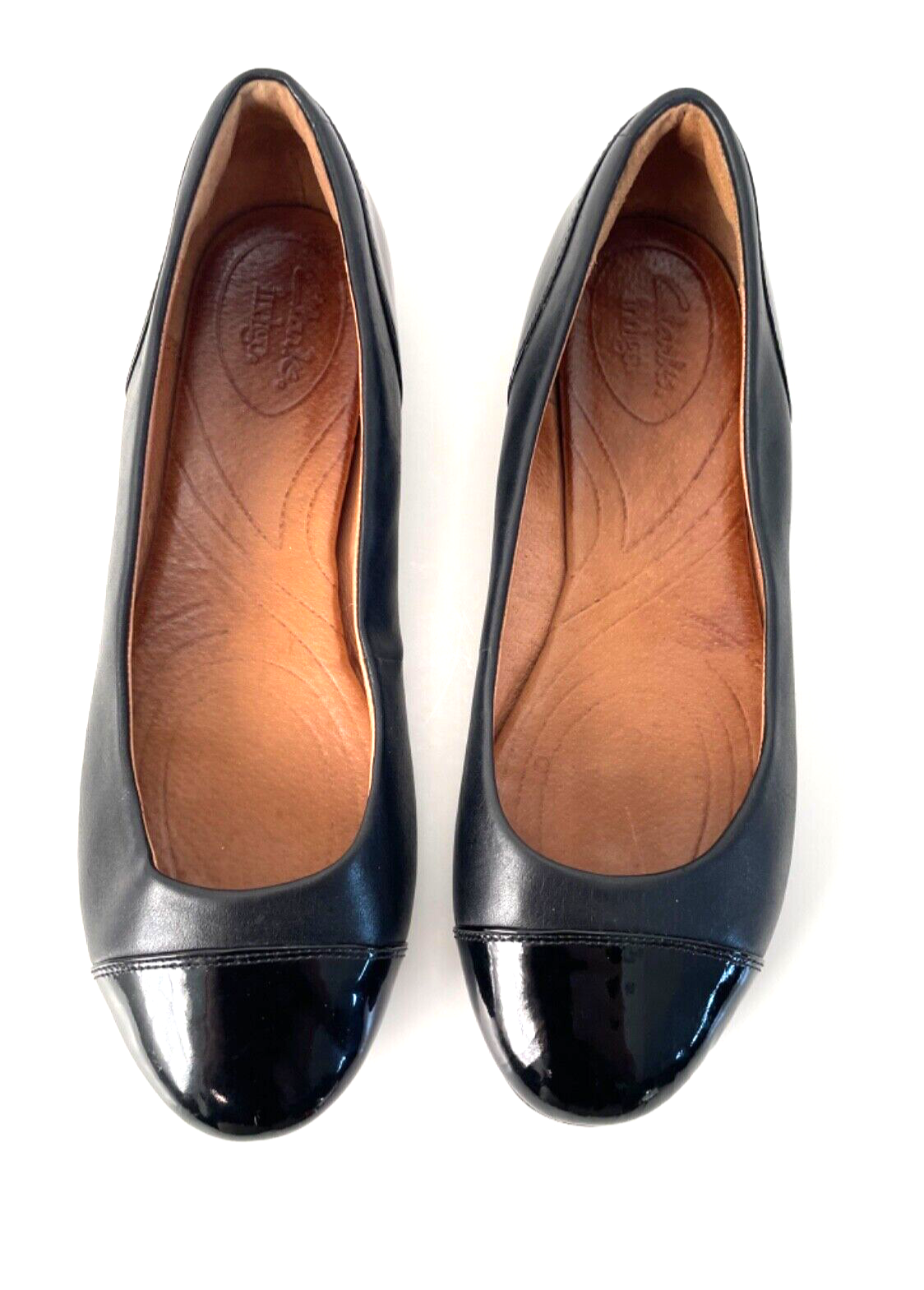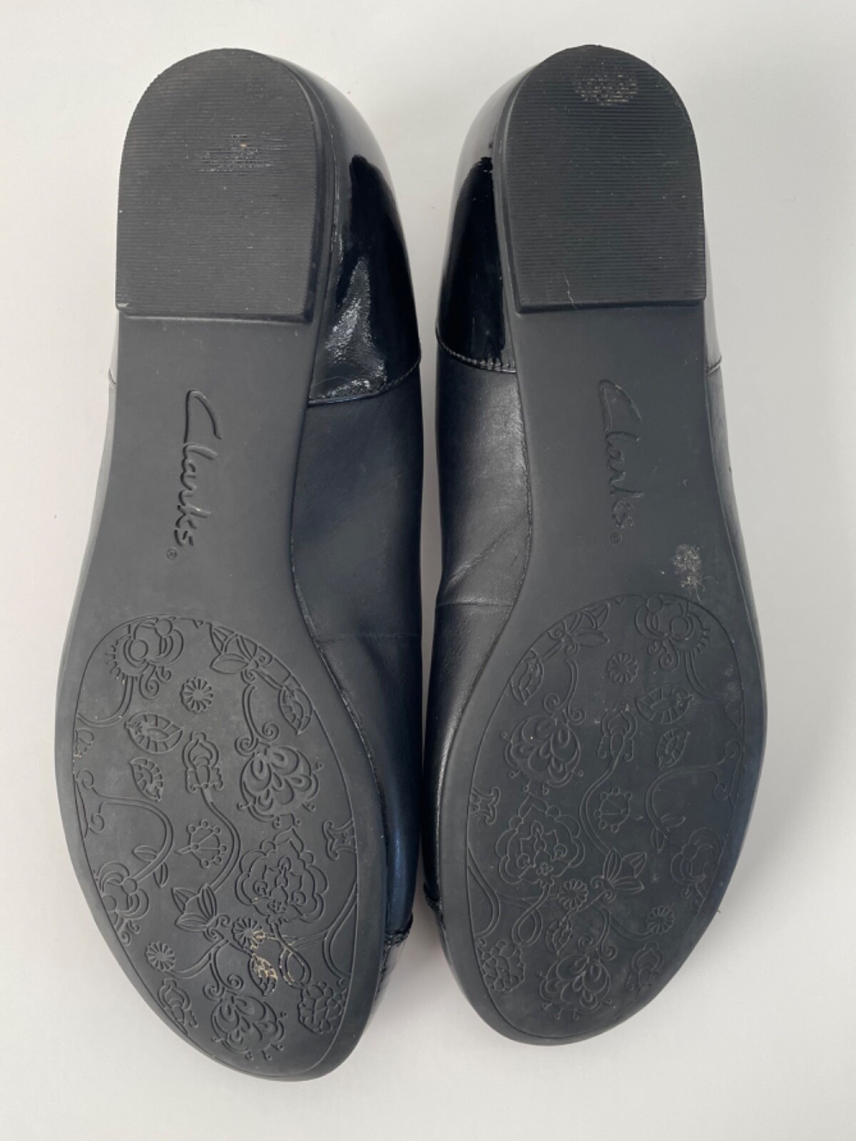 Clarks patent leather and leather combo black ballet flats size 9. Some spots are on the inside sides of the shoe.