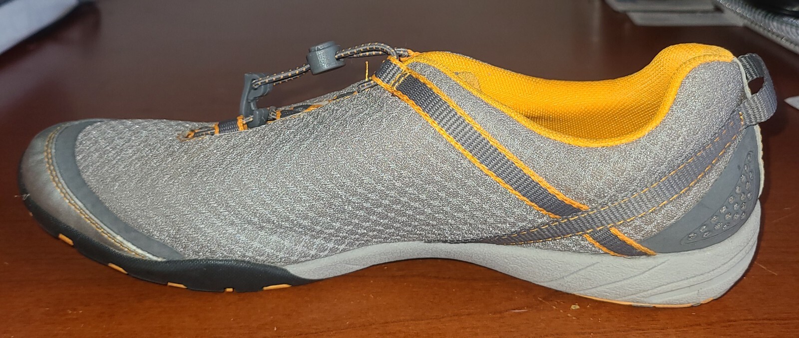 Elevate your activewear game with these Clarks Primo Women's 9M Shoes. These drawstring athletic sneakers come in a stylish gray and orange color combination and feature a low top shoe shaft style. The synthetic upper material is breathable and accented with the Clarks logo, while the fabric lining material ensures comfort. The shoes have a rubber outsole and cleat type, making them suitable for walking, cross-training, and running & jogging. They are perfect for any season - winter, summer, fall, and spring. These shoes are part of the Clarks product line and are customized to fit women's shoe size 9 (US) and 7 (UK), with an EU shoe size of 40. Get ready to hit the sports theme with these athletic shoes from Clarks.