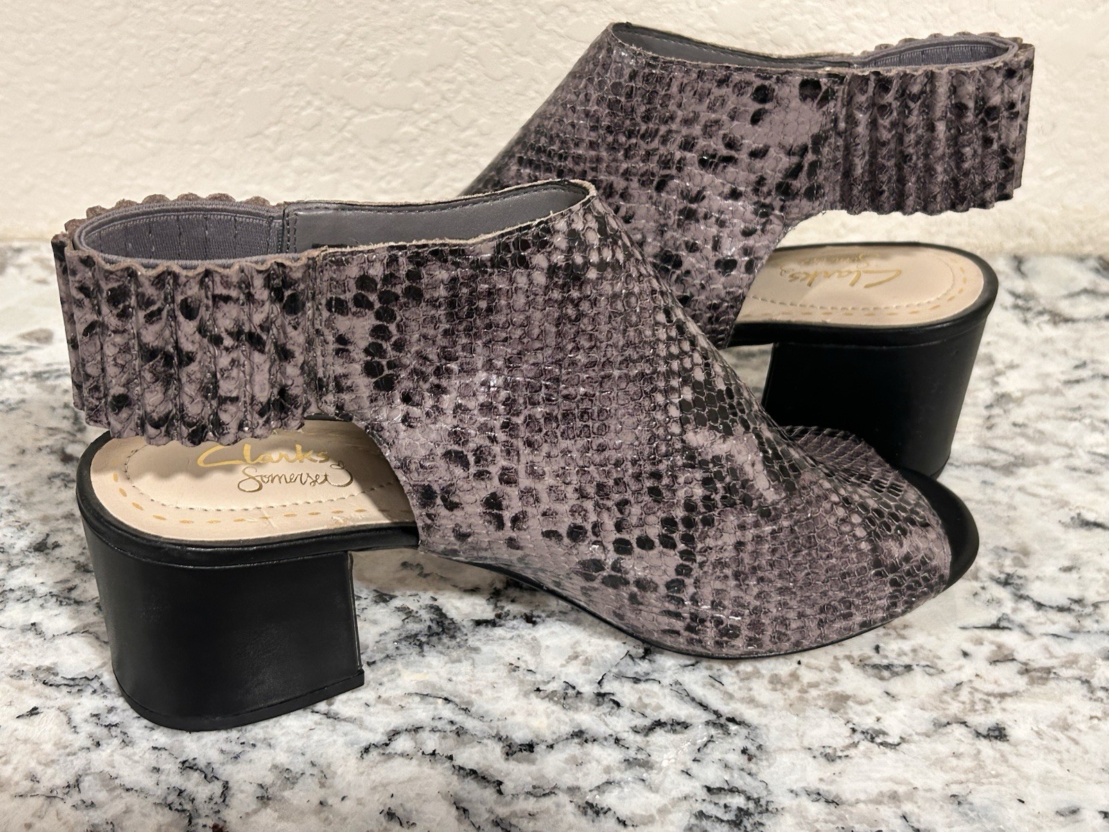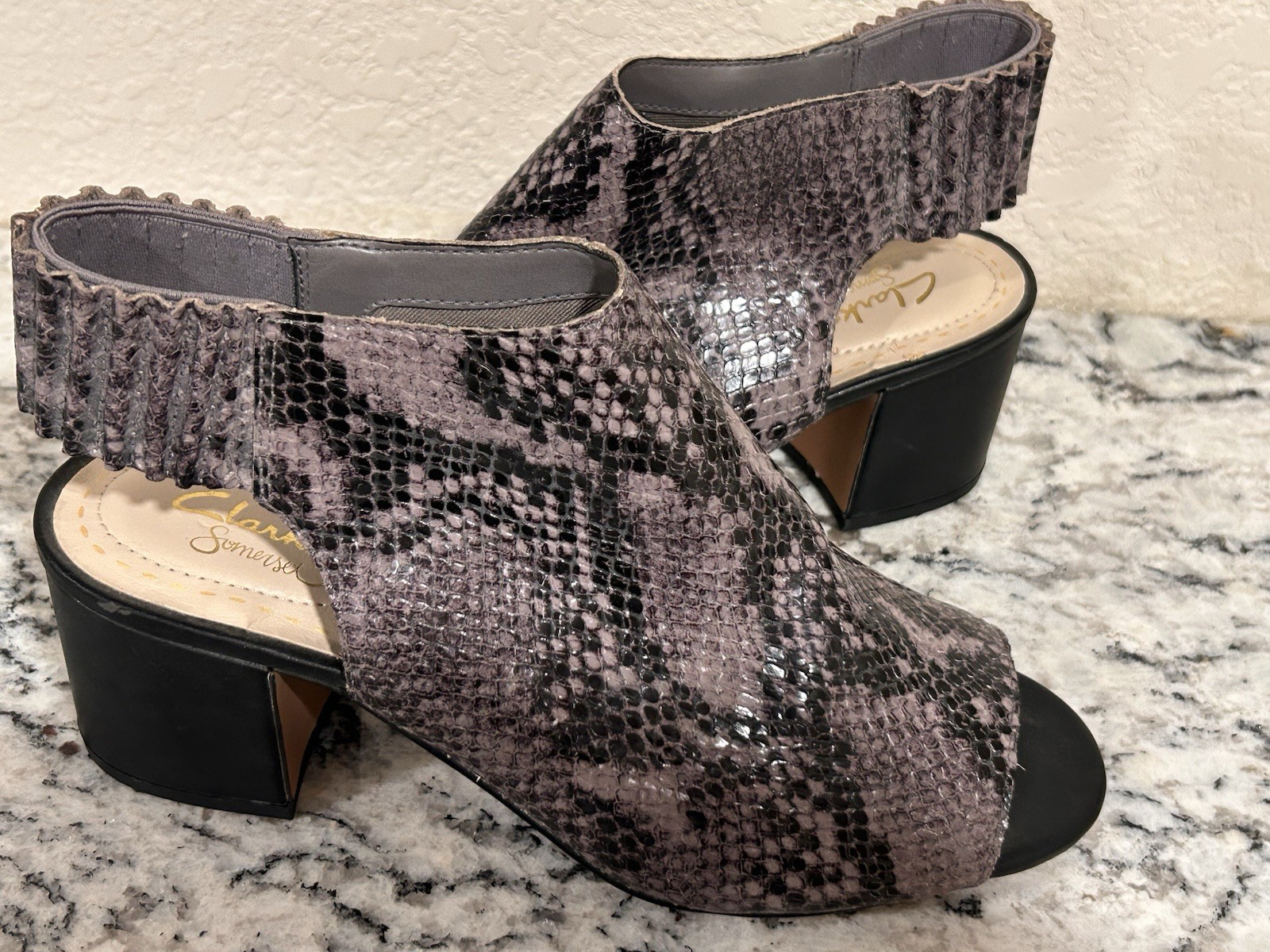 New Clarks Somerset Womens 8 Slingback Mule Sandals Snakeskin Leather Open Toe! Please see all pictures for condition. These are new without box. If you have any questions or would like more t pictures please feel free to contact us and we will be happy to help with any questions you have about this item. And as always thank you for looking at this item. Thank you for visiting FnA Stuff N Stuff!! 😊