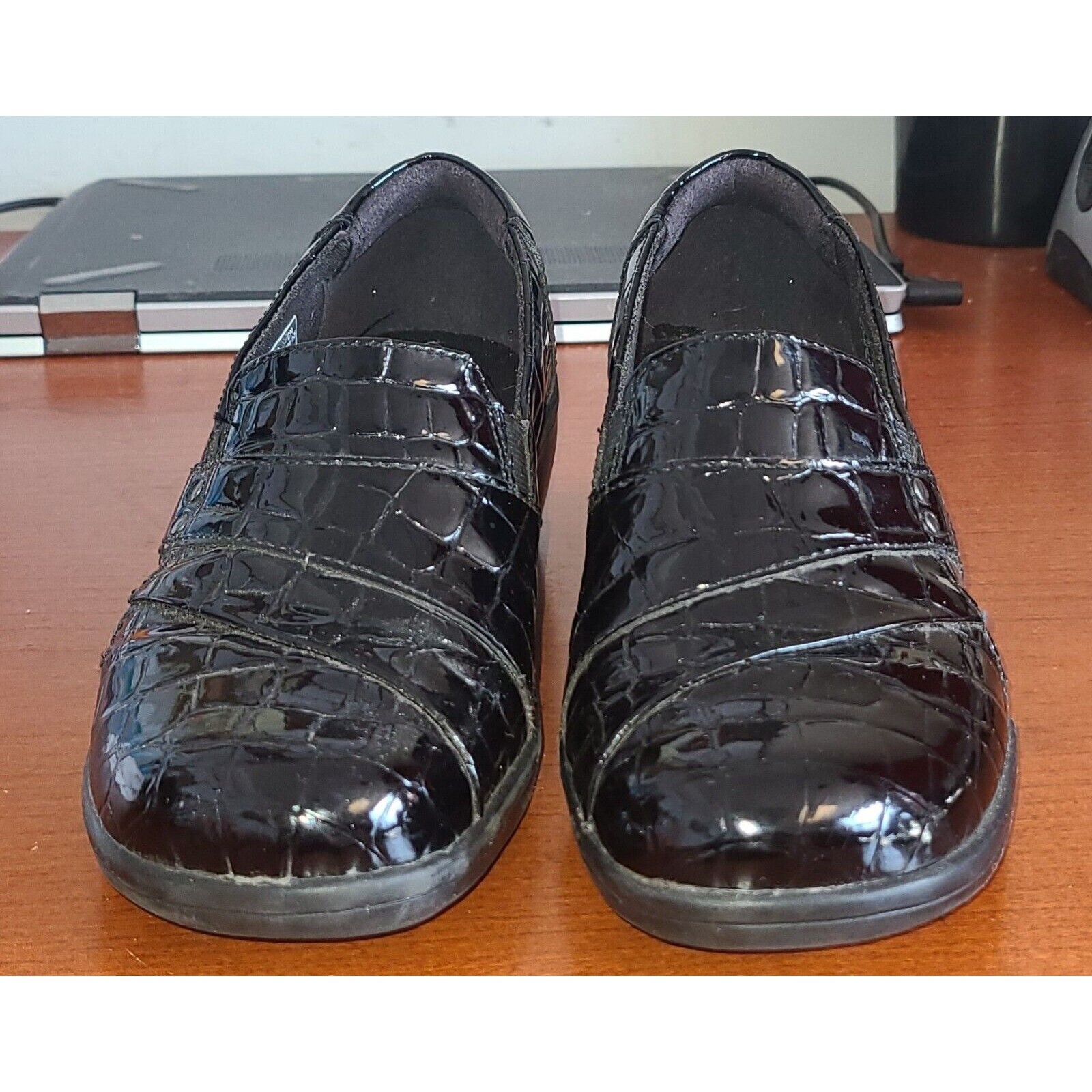 Elevate your shoe game with these stylish Clarks slip-on loafers. The black croc patent leather upper material is complemented by a round toe shape and rubber outsole for added durability. The faux leather upper material is synthetic, making it easy to care for. The shoes are designed with a standard shoe width and a slip-on closure for easy wear. These Clarks shoes are perfect for women who want to add a touch of sophistication to their wardrobe. The solid pattern and synthetic lining material make them comfortable to wear all day long. The shoes are available in UK shoe size 2.5, US shoe size 5, EU shoe size 35, and AU shoe size 4.5. Get your hands on these slip-on loafers today and step out in style!