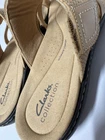 These Clarks Laurieann Edge sandals are in light tan leather with a slip-on style and adjustable strap. They feature a low wedge heel, cushioned comfort, and are suitable for spring and summer wear. The sandals are designed with a flat style, making them a versatile and comfortable choice for women's footwear. Gently worn, like new