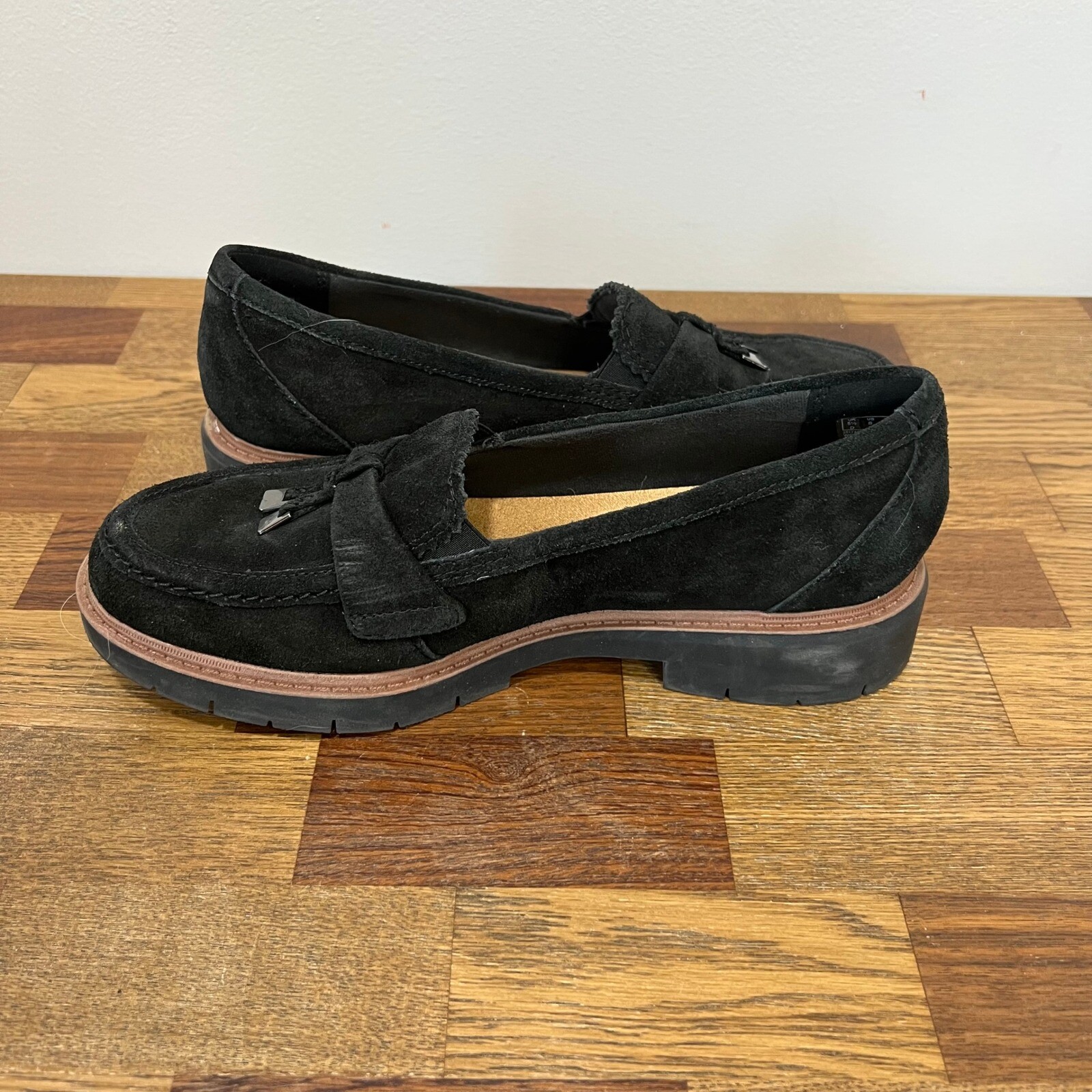 Clarks Womens Westlynn Bella Loafer 8 Black Suede Leather Comfort Tassel Slip On Womens size 8 Good preowned condition. No flaws but normal wear