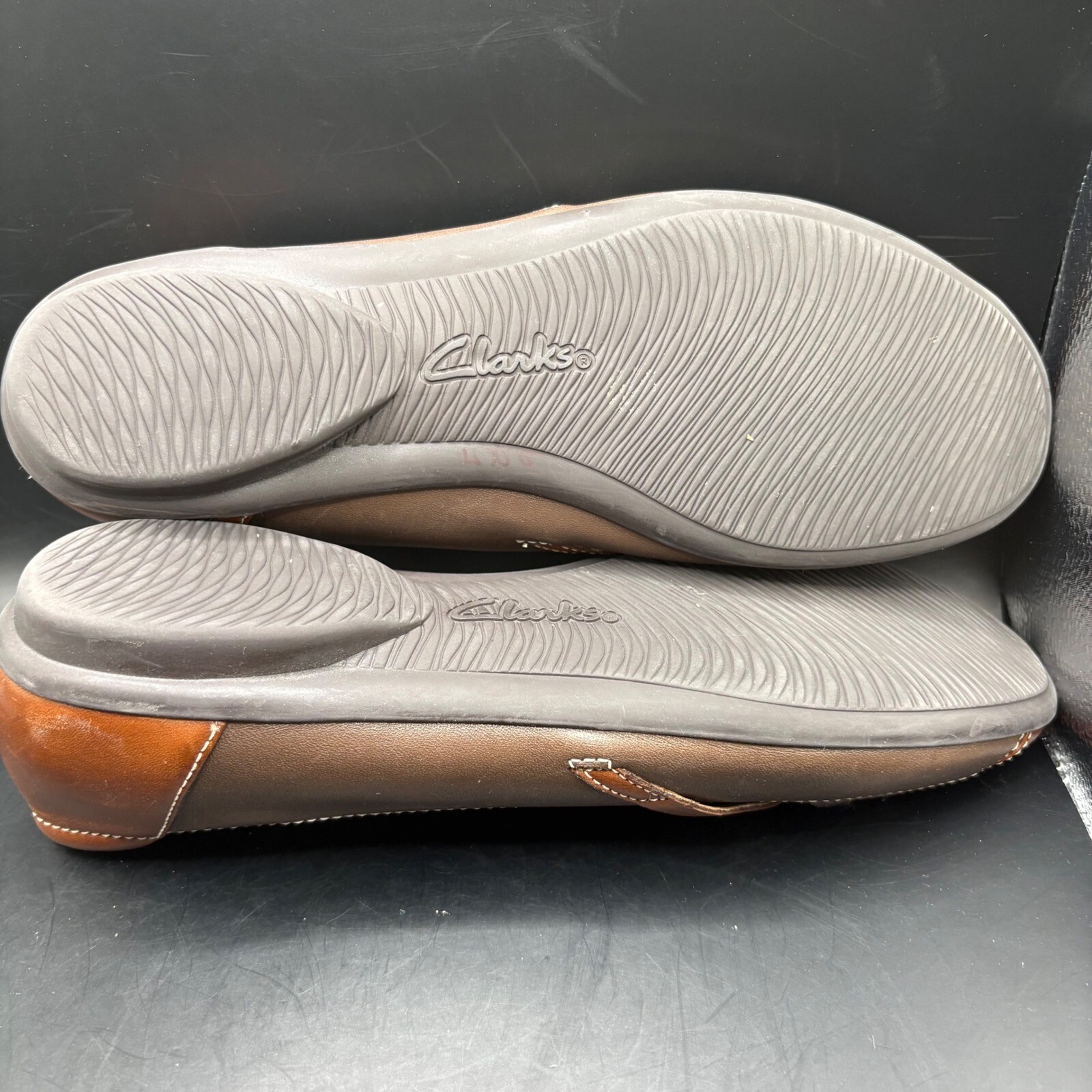 Stylish and comfortable, these Clarks Collection loafers are a versatile addition to any wardrobe. Featuring a unique woven leather design across the vamp, these flats offer a blend of sophistication and casual appeal. The rich brown color complements the detailed stitching, while the 'Cushion Soft' insole ensures all-day comfort. These shoes are perfect for adding a touch of elegance to your everyday look. Keywords: Clarks, loafers, flats, woven leather, brown shoes, comfort shoes, cushion soft, womens shoes, size 8.5M, casual flats, leather loafers, slip on shoes