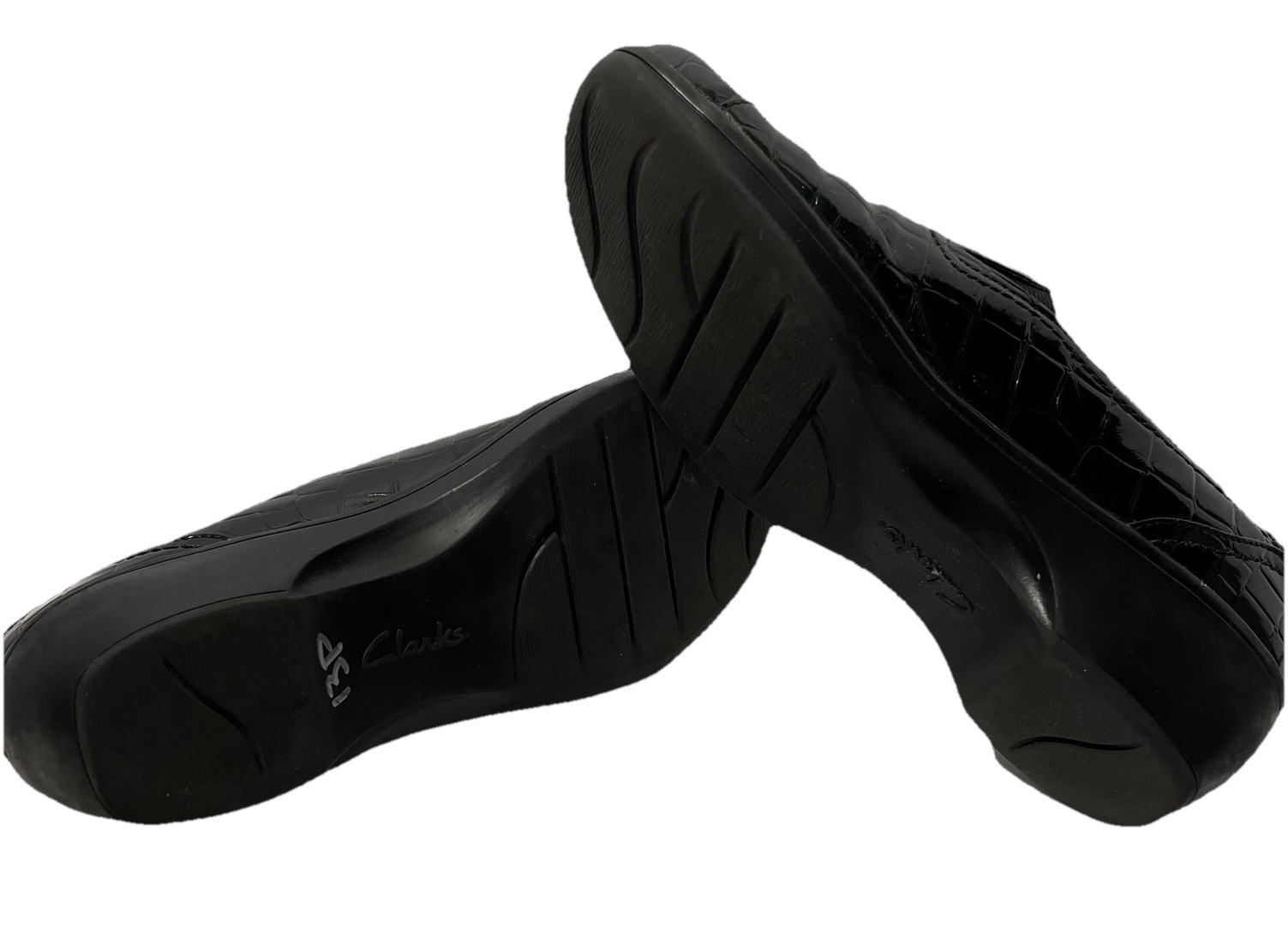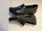The product is a pair of Clarks women's dress shoes with a round toe, 2" heels, and a slip-on closure. These black shoes are made of man made material with a textured faux alligator pattern, featuring a wedge heel for comfort. The size is 8.5M, making them suitable for various occasions including travel, parties, casual outings, christenings, and business meetings. Perfect for the winter and fall seasons, these stylish heels are a versatile addition to any woman's wardrobe.