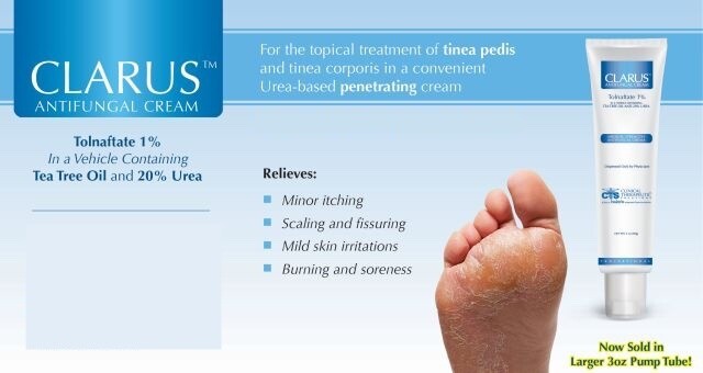 ONE 3 oz. Tube Clarus Antifungal Cream Dosing: Once or twice daily application for 4 weeks CLARUS ANTIFUNGAL CREAM, 1% Tolnaftate, is a safe, effective, medical-grade urea-based formulation indicated for the treatment of athlete’s foot (tinea pedis) and ringworm (tinea corporis). CLARUS ANTIFUNGAL CREAM is designed to enhance the penetration into the skin. An effective treatment for tinea infections with daily use, CLARUS ANTIFUNGAL CREAM relieves symptoms of itching, burning, and cracking of the infected area, while softening and moisturizing the skin. CLARUS ANTIFUNGAL CREAM also contains inactive ingredients including tea tree oil, aloe vera, and urea, essential for healthy feet. Product and Attributes: White cream-based formulation Smooth & silky feel Easily absorbs into skin Leaves no white chalky residue on skin Clean scent Paraben-free