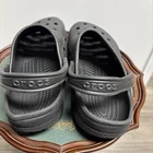 The product is a pair of unisex black Crocs in women's size 9 and men's size 11. These slip-on clogs feature a closed toe design and are made of rubber, making them comfortable and suitable for casual, travel, or workwear occasions. The classic black color and rubber outsole ensure durability, while the brand's reputation for comfort makes these Crocs a versatile and practical choice for the warmer seasons of summer, fall, and spring.