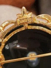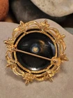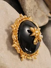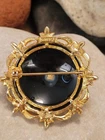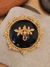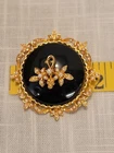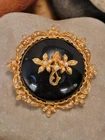 This vintage brooch by ART is a classic piece inspired by Victorian jewelry. The round black onyx stone is beautifully complemented by the goldtone metal and seed pearl accents. The brooch is signed by the maker and measures 1 7/8" in length. Very nice pre-owned vintage condition ! "Mode-Art, a jewelry company founded in New York City in the late 1940s, was owned by Arthur Pepper. This "ART" mark was used after 1955 as indicated by the copyright symbol. The company also used the mark "Mode Art" on its pieces. Mode-Art competed directly with Florenza in terms of style, but the founders of both companies counted one another as friends."