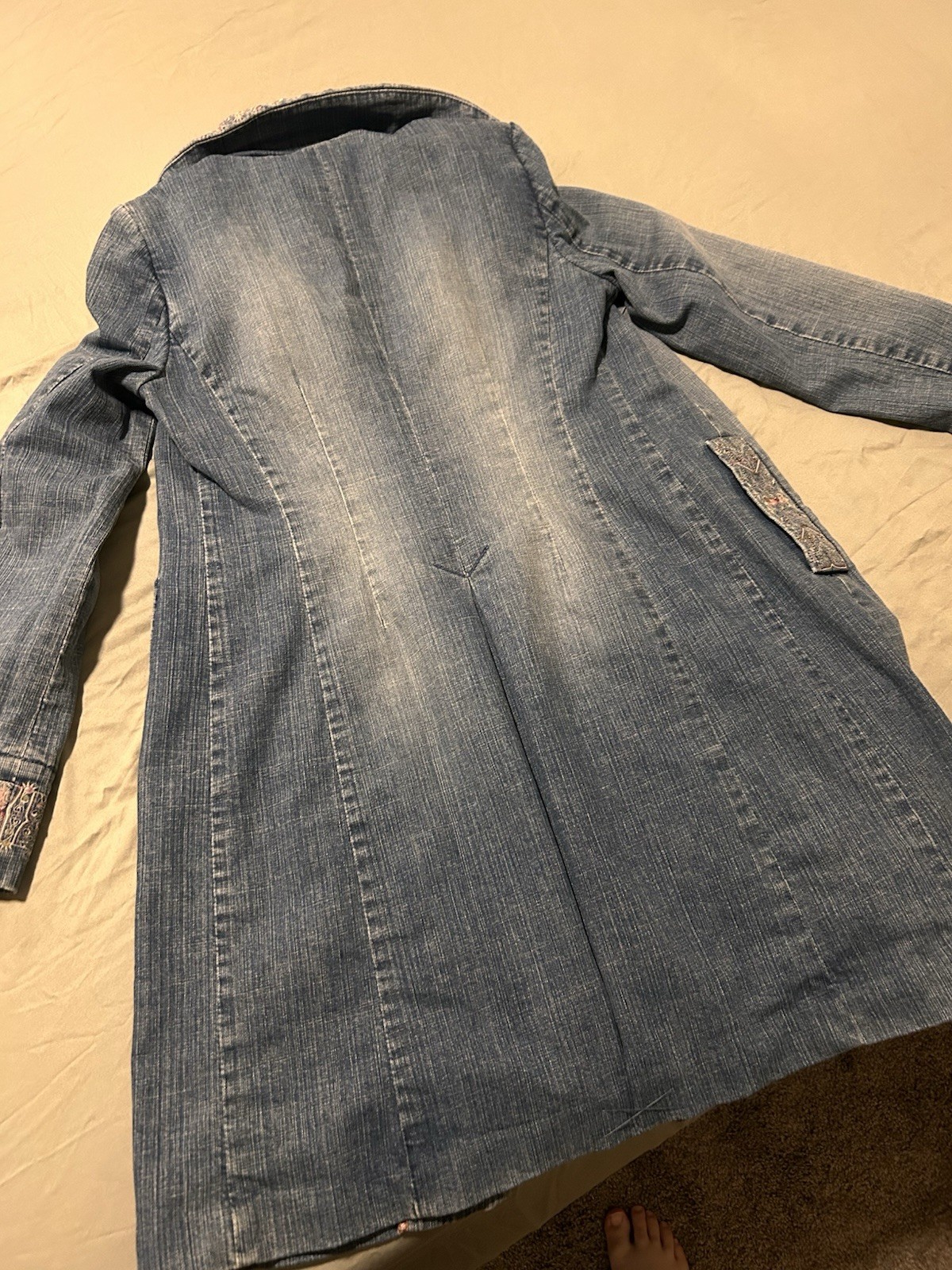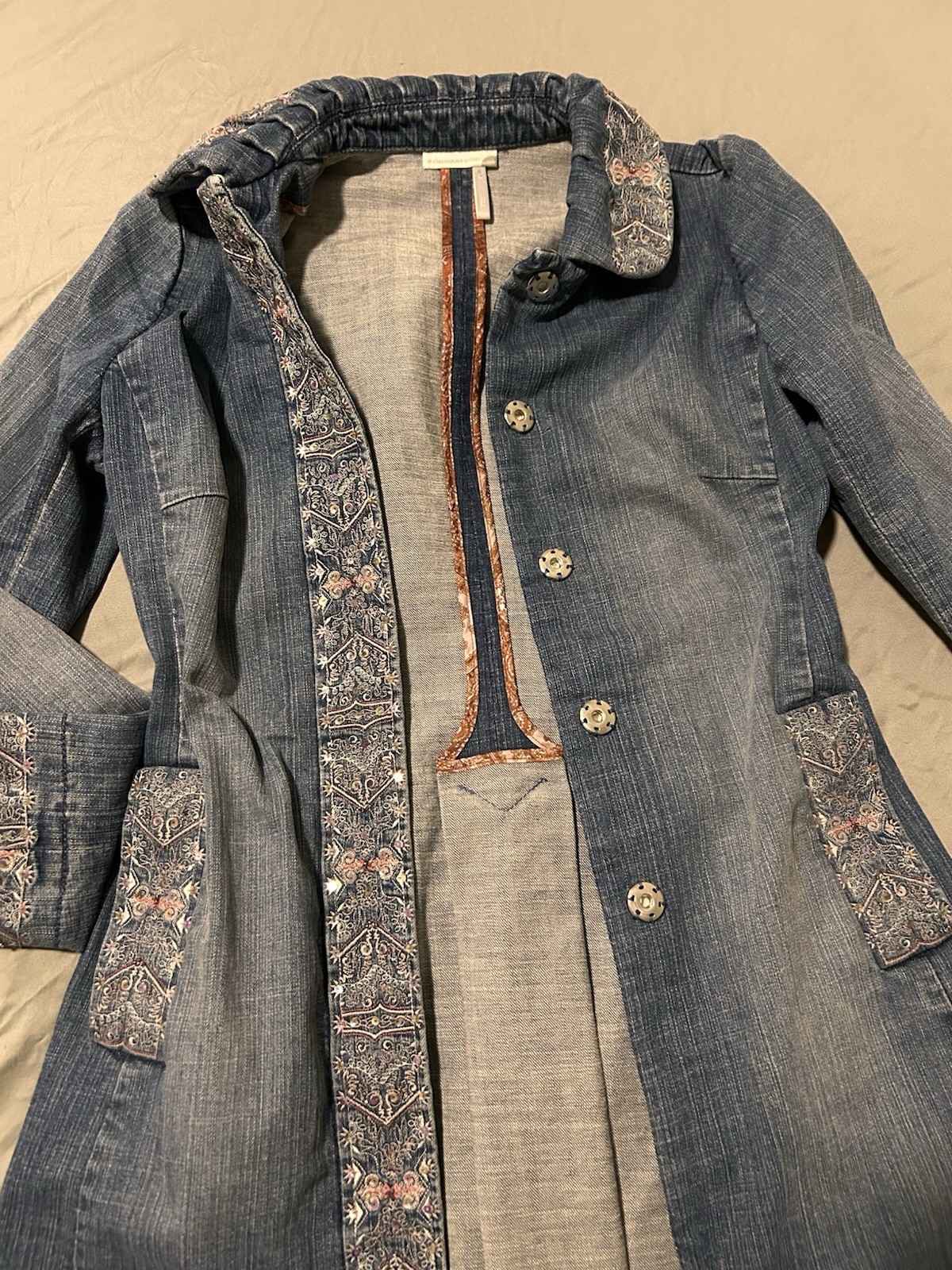 The Classiques Entier Discontinued Denim Longline Jacket in size Small is a stylish and versatile outerwear piece perfect for casual occasions. Made from 100% cotton denim in a solid blue color, this long jacket features a button closure and is designed for women. With a classic overcoat style, this jacket is suitable for all seasons and can be dressed up or down for a variety of looks. Perfect for adding a touch of edge to any outfit, this timeless piece from Classiques Entier is a must-have for any wardrobe.