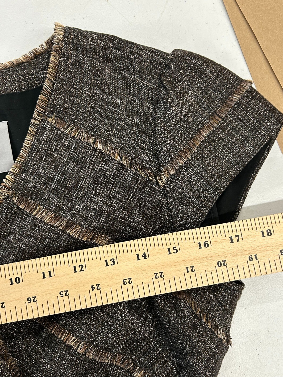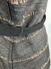 The Classiques Entier Women's Surplice Bust Tiered Blouse in black is a stylish and elegant top perfect for casual occasions. This blouse features a V-neckline, zip closure, and short cap sleeves. Made from a blend of polyester, viscose, and wool, it offers a comfortable fit with an extra-slim cut. The tiered accents and belted design add a modern touch to this timeless wardrobe staple, making it a versatile piece suitable for all seasons. Made in the 2020s, this blouse is a must-have for any fashion-forward woman looking for a chic and sophisticated look.