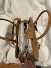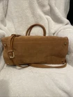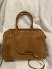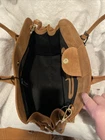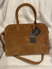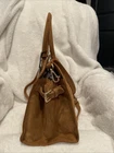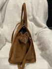 This is a trendy Claudia Firenze Italian suede tote bag, made in Italy. The bag is crafted from genuine suede with a solid pattern in brown color. It features a snap closure and has a large size, measuring 10.5 inches in width, 15.5 inches in height, and 8 inches in depth. This limited edition bag is designed for women and embodies an Italian theme.