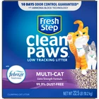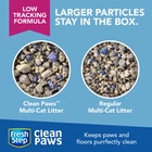 Help keep your cat's paws and your home clean with Fresh Step Clean Paws Multi-Cat Litter. Made using a special blend of larger particles, this low-tracking Fresh Step Clean Paws Cat Litter is designed to stay in the litter box and stick less to your cat’s fur, minimizing messes. This extra-strength clumping litter formula features more odor-fighting power to handle multiple cats. Ammonia Block Technology combined with the power of Febreze neutralizes even the strongest litter box odors for 10 days guaranteed (1). Cleaning the kitty litter box is fast and easy with this Fresh Step clumping cat litter that quickly absorbs liquids and forms clumps for effortless scooping. In addition to offering fast cat litter clumping, this Fresh Step litter features a low-dust formula designed for less mess and a cleaner home. Enjoy more catnaps and cuddle time with your kitty when you choose Fresh Step cat litter. (1) See package for more information on terms and conditions On Sep 9, 2024 at 18:34:46 PDT, seller added the following information:
