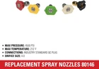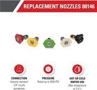 Universal fit: Simpson Pressure Washer Spray Nozzle Tips are a must-have accessory for any DIY or professional power washing project. These can be used for deck cleaning, concrete patios, paint preparation, sidewalks, lawn furniture and more; check out our guide to choose the correct nozzle for your project. Easy connections: The 1/4-Inch QC connection makes these nozzles easy-to-use with most power washer extension spray wands and lances; These nozzles are hot- and cold-water compatible 5 tips for any need: 0-degrees (red) for tough cleaning jobs; 15-degrees (yellow) for heavy-duty cleaning and stripping; 25-degrees (green) for general tasks; 40-degrees (white) for softer surfaces; Soap (black) allows you to combine water with cleaning soap for your task if applicable Quality construction: Simpson replacement nozzles are made for reliability and durability Specifications: Max PSI - 4500; Max temperature - 212° F; Orifice size - 4.0 Simpson 4500 PSI quick connect spray tips nozzle Set, Replace worn or lost spray tips for hot and cold water pressure washers, includes 4 high pressure, stainless steel quick connect spray nozzles and 1 low pressure spray nozzle, spray patterns: from pin point, for those tough jobs, to wide fan for low pressure cleaning, designed to fit most gas pressure washers with quick connect spray wands.