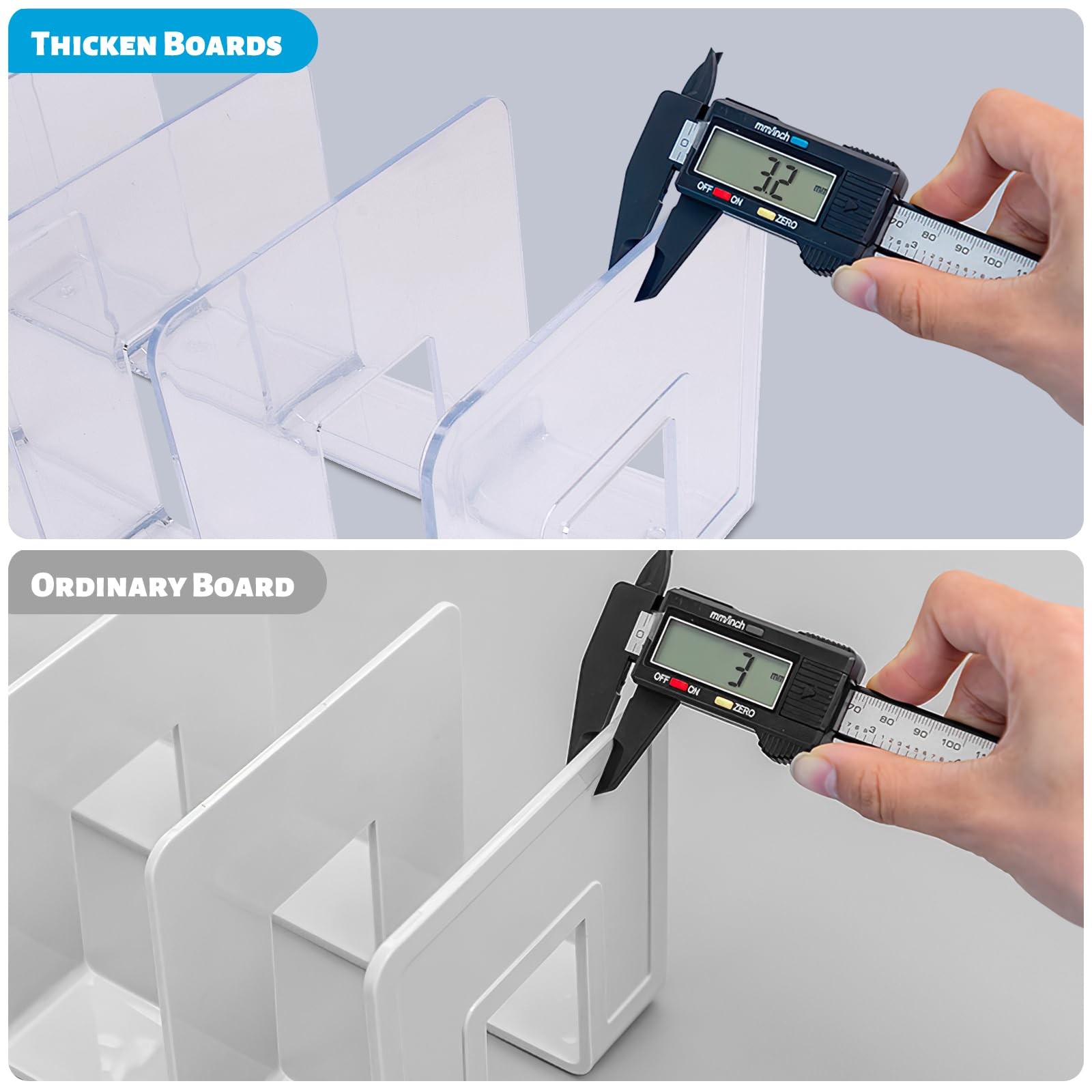 Having acrylic file sorter will keep your desktop neat and organized and save space. The vertical file holder is perfect for organising magazines, letters, books, binders, folders, etc. Features: 1. Premium Acrylic Material The desktop file organizer is made of thick acrylic material, 3.2 mm thickened dividers, sturdy and durable. One-piece structure, not easy to break, good load-bearing capacity. 2. Non-Slip Design The acrylic file sorter has a non-slip design, making it stable when you place your files or items. And the divider underneath is widened to make the acrylic file organizer more stable, so it won't tip over even if you put books on the side. 3. Stylish and Neat The acrylic file holder is crystal clear, making everything visible, and its elegant and atmospheric style will blend perfectly with your office or home. 4. Smooth Edge The corners and edges of the acrylic desk organizer are polished, rounded and smooth, without hurting your hands. 5. Hollow Design It is easy and comfortable for you to move the file holder, and also allows the file to be ventilated and dry. 6. Multipurpose File Organizer It can also be used as a merchandise display rack, ideal for displaying electronic devices, cosmetics, drinks bottles, tableware, etc. Specification: 1. Material: Thick Acrylic Material 2. Color: Clear 3. Size: 12.6x5.7x5.1 inch/ 32x14.5x13 cm (WxDxH). 4. Compartment Width: 2.95 inch/ 7.5 cm. Package Includes: 2 × Acrylic File Holder PREMIUM ACRYLIC MATERIAL: The desktop file organizer is made of thick acrylic material, 3.2 mm thickness dividers, sturdy and durable. One-piece structure, not easy to break, good load-bearing capacity. Size: 12.6x5.7x5.1 inch. The file sorter has 4 compartments of 2.95 inch each. NON-SLIP DESIGN: The acrylic file sorter has a non-slip design, making it stable when you place your files or items. And the divider underneath is widened to make the acrylic file organizer more stable, so it won't tip over even if you put books on the side. STYLISH AND NEAT: The acrylic file holder is crystal clear, making everything visible, and its elegant and atmospheric style will blend perfectly with your office or home. Having our clear desk organizer will also keep your desktop neat and organized and save space. SMOOTH EDGE AND HOLLOW DESIGN: The corners and edges of the acrylic desk organizer are polished, rounded and smooth, without hurting your hands. Together with its hollow design, it is easy and comfortable for you to move the file holder, and also allows the file to be ventilated and dry. MULTIPURPOSE FILE ORGANIZER: The vertical file holder is perfect for organising magazines, letters, books, binders, folders, etc. It can also be used as a merchandise display rack, ideal for displaying electronic devices, cosmetics, drinks bottles, tableware, etc.