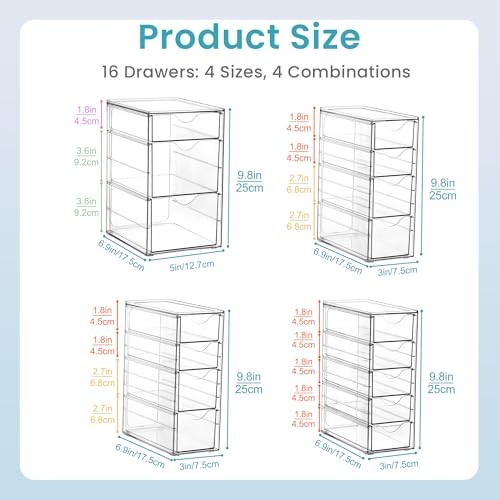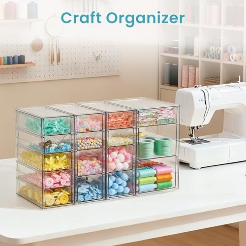 Clear Desk Organizer Set of 4, Acrylic Pen Organizer with 16 Drawers for Office Supplies, Makeup, Art Craft, Jewelry Storage Clear Desk Organizer Set of 4, Acrylic Pen Organizer with 16 Drawers for Office Supplies, Makeup, Art Craft, Jewelry Storage 4-pack clear drawer storage boxes with a total of 16 drawers for efficient space utilization. Non-slip pad included to prevent sliding and protect desktop surfaces. Made of shatterproof plastic, offering dustproof and waterproof properties. Versatile use as a pen organizer, makeup organizer, or for storing craft supplies. Transparent design allows for easy visibility of contents, reducing clutter and cleaning time. Includes drawers in 4 sizes to accommodate various storage needs across different rooms.