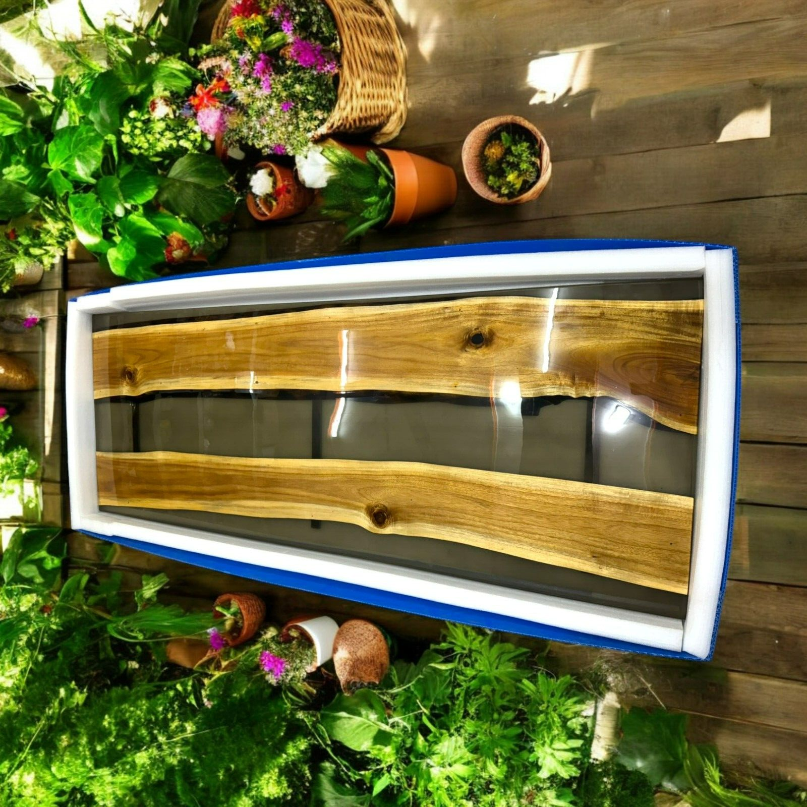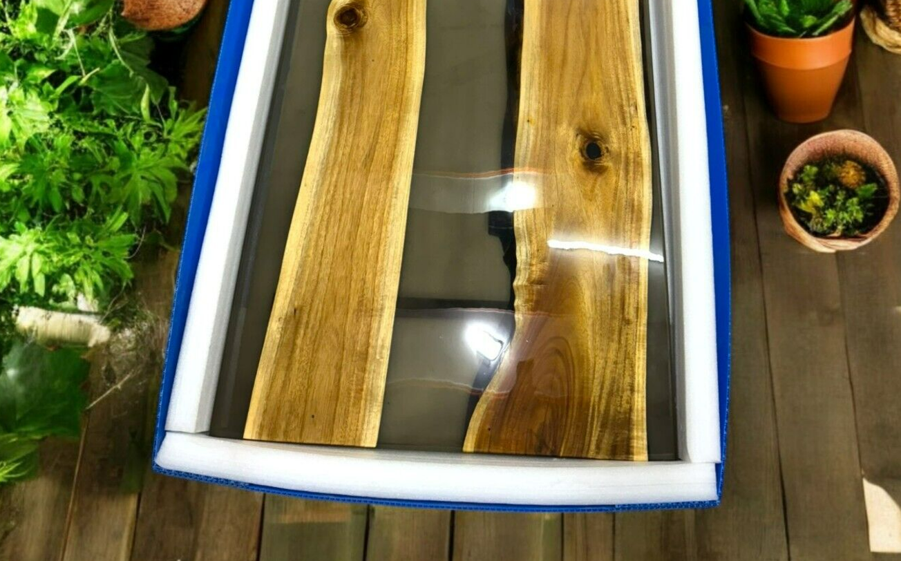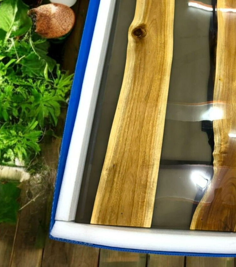 Our epoxy tables are custom-made, and we strive to use the same type of wood as depicted in our advertising pictures. However, it is not always possible to find an exact match, which may result in slight variations in the epoxy color and wood grain pattern. It's important to keep in mind that the table you receive may not be an exact replica of the advertising picture. We ensure that our clients are informed of every step of the process, from the selection of the wood to the final finish of the table. We keep our clients up-to-date throughout the process to ensure transparency and avoid any misunderstandings. Additionally, our price includes air delivery right to your doorstep via DHL/Fedex/UPS and insurance protection. Please note that you may be responsible for paying any applicable tax and duty on delivery. If you have any concerns or doubts, we highly recommend addressing them before making a purchase. Clearing any doubts beforehand will help avoid any issues and ensure a smooth buying process. It's important to note that any accessories depicted in the advertising images, such as knives, chairs, or lighting, are not included with the product and are only used for photography purposes. Additionally, please keep in mind that the price of the product does not include any type of legs. We recommend addressing any questions or concerns before making a purchase to avoid any misunderstandings.