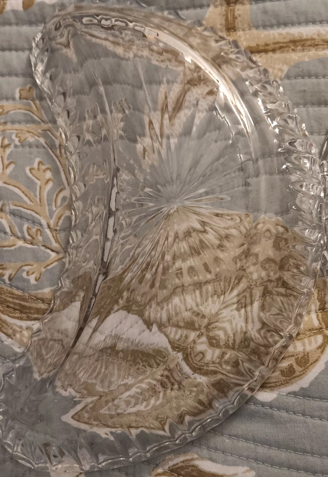 This Clear Fruit Glass Half Moon Curved Condiment Relish Nuts Side Dish Glass Set 2 features a unique and stylish design, perfect for serving condiments or snacks in a decorative manner. Made of glass with a clear color and a fruit pattern, this condiment dish has a single compartment and a curved half moon shape. The set includes 1 piece and is part of the Indian product line, manufactured in China in the 2000-2009 time period using fused glass production technique. This original vintage piece adds a touch of elegance to any table setting.