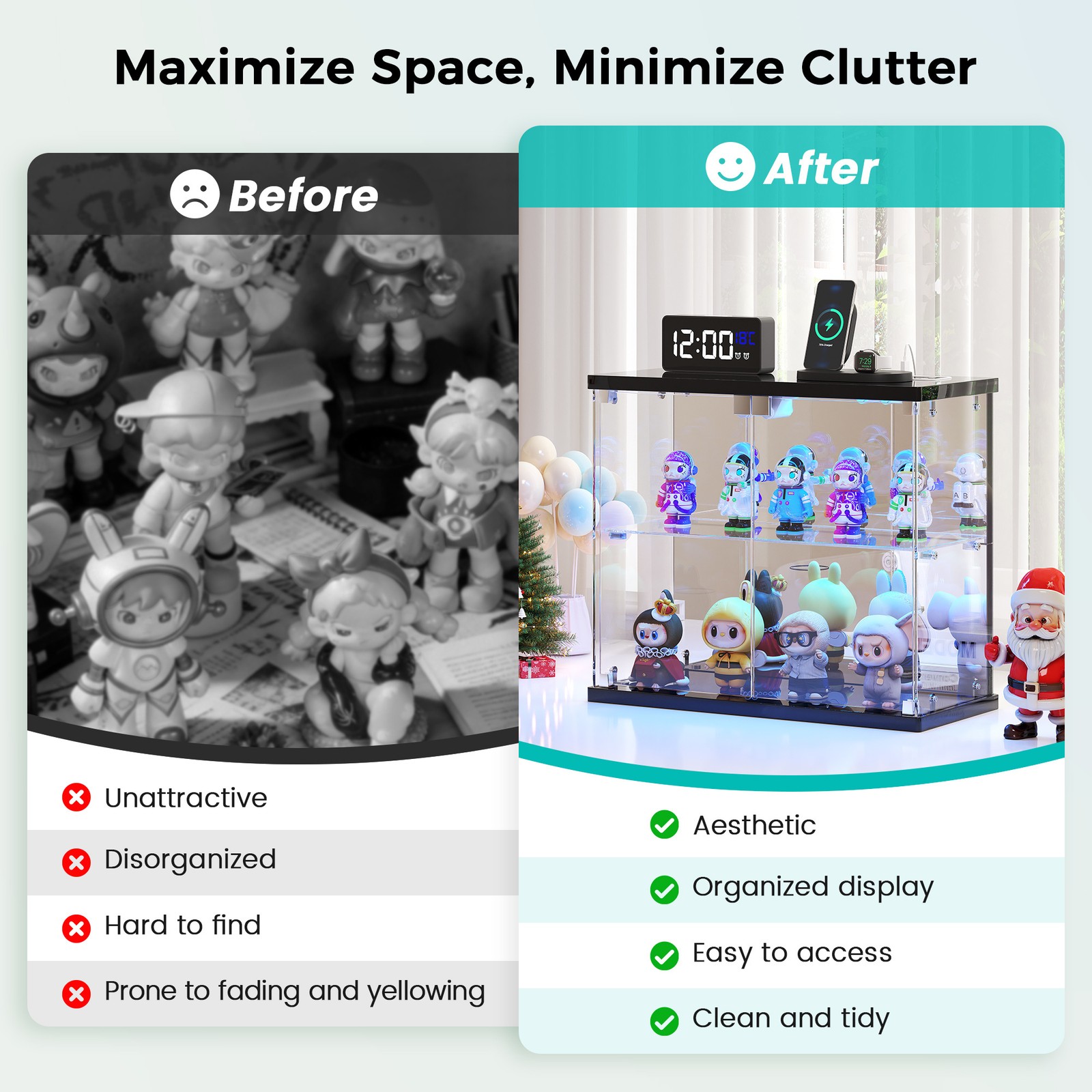 Magnetic Door with Safe Tempered – Featuring a press-to-open design, you can easily access your items with just a gentle push. This display box utilizes explosion-proof tempered glass is both crystal clear and safe. It effectively dustproofs and yellowing resistance that let your small Lego displays, perfumes, toys, or décor can be completely visible Light Control Module with Motion Sensing - This smart showcase upgrades your collection display with built-in LED lights(white, yellow, blue). The human sensor automatically switches the lights on when you approach within 1 meter, and turns them off after 30 seconds, achieving both energy efficiency and a stunning visual display Integrated Charger Station – This display organizer comes equipped with a built-in Type-C and a USB port, enabling simultaneous charging for two devices. Conveniently power your phone, tablet, earbuds, or smartwatch without the need for extra adapters. Keep your essentials fully charged overnight while maintaining a clean, cable-free display surface Mirrored Back Panel – With a mirrored back, this glass display case reflects your collectible figurines, visually expanding the space and adding remarkable depth to each piece. Not only does it brighten the entire display, but it also turns any ordinary space into a dynamic and eye-catching part of your bedroom Easy Assembly with Clear Instructions – Each panel is clearly labeled, and detailed step-by-step guides will walk you through the process. For optimal ease, using power tools is better. Enjoy a creative hour of assembly as a rewarding project with your partner or family Our product frames are all made of FSC-certified wood Lighting for Your Display Charge Hub for Your Desk Tempered Glass: Why It’s Clearly Better Gifts to Display & Delight