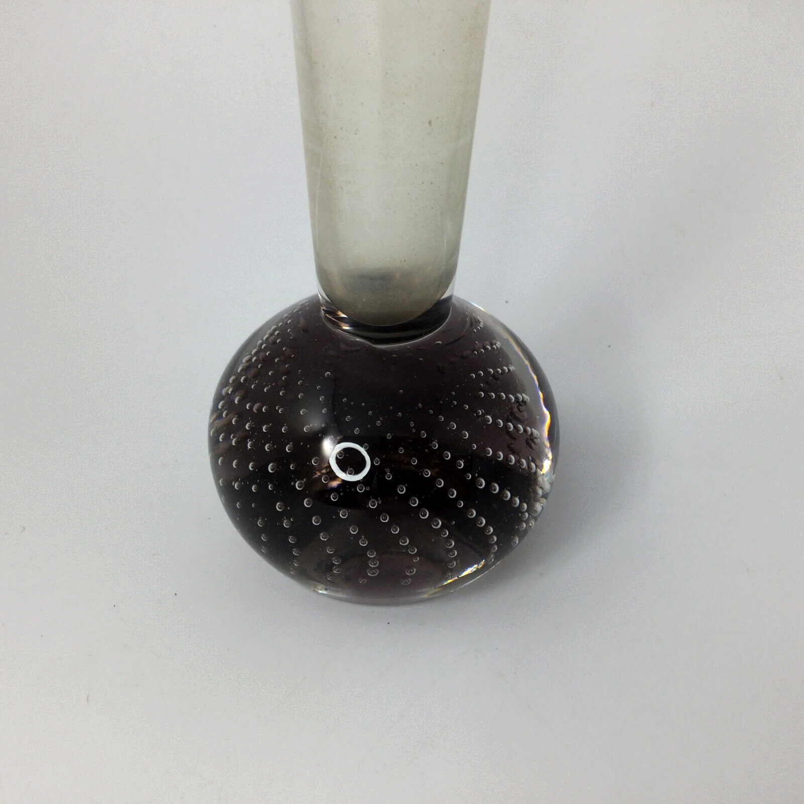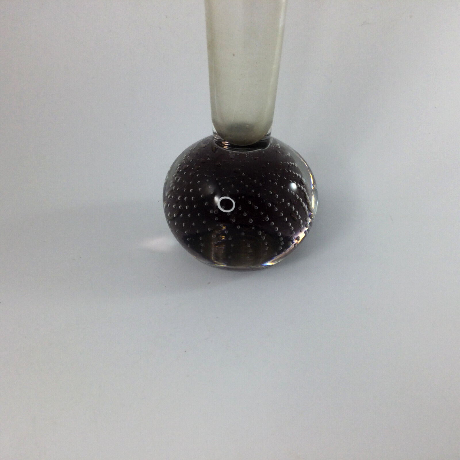 Small Glass Flower Vase Clear Purple and Controlled Bubble Ball Base 10 in H , base is 2.5" ball. Very good condition, no cracks or chips. InvN/GS/1