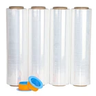 4 Pack Industrial Clear Stretch Wrap Film: Each order contains 4 rolls of stretch wrap with 2 reusable plastic handles. Each roll is 18 inches wide x 1000 feet long and the 80 gauge thickness film is extremely strong Multipurpose Use: Whether you’re wrapping pallets for cargo or moving furniture, this stretch wrap film is ideal for items to protect while moving. You can use our stretch film for packing of various things, like boxes and logistical needs Ideal for All Your Moving and Storage: This stretch wrap roll make sure your valuables stay safe while in storage, on your next move or during shipment. It's provide protection from the elements, moisture and rough handling, and can help prevent scratches, dings and dents to your valuables. Just stretch, wrap and relax-your belongings are sure to arrive right where you left them, No Features: Clear non-adhesive plastic wrap secures and bundles Items. You can use this for the garage and some warehouses. Brings things together for storage/handling...things like poles and parts that you don't want to wrap with tape Usage: This stretch film comes with 2 rotatable plastic shafts, which saves time and effort and reduces the damage to your hands during the packaging. It helps protects things, keep them together, keep them sealed, and generally acts as an easier-to-use/not-as-destructive stand-in for tape in many cases. The plastic roller makes it so easy to use. And roll seems to last forever