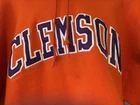 Here is a Clemson Tigers heavy pullover hoodie in men's size Large, designed by Champion. It features the team's vibrant orange color with purple letters. This hoodie is perfect for showcasing team pride and staying warm during games or events. 50% cotton - 50% polyester, fleece lining. Machine wash and dry. Back length - 26", chest - 46". Full kangaroo pocket. Very good previously owned condition.