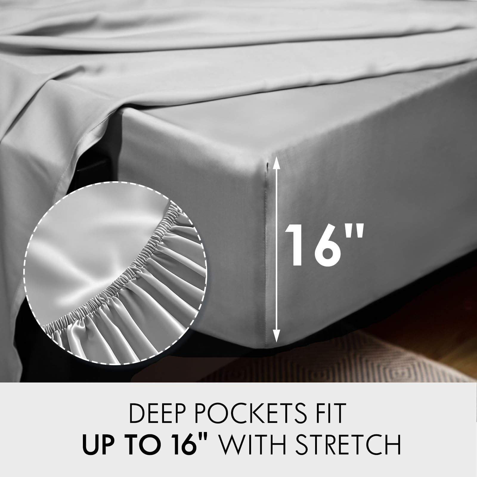 4 PIECE BED SHEET SET: Includes 2 Pillowcases, 1 Flat Sheet, and 1 Fitted Sheet. Flat Sheet (105" x 102"), Fitted Sheet (78" x 80"), Pillowcases (20" x 40"). Deep Pocket Sheet Set: Indulge in luxury with our elasticized deep-pocket sheet, fitting mattresses up to 16 inches thick. Its versatile size suits most beds, even smaller ones. Ultimate Coolness and Softness: Experience cool comfort with our bedding. It naturally regulates temperature, wicks away moisture, and offers ultimate softness. Perfect for hot sleepers and sensitive skin. Super Soft Sheets: Crafted from 300 TC satin fiber fabric, our bedding sheets are incredibly soft, smooth, and silky. 300 thread count is the optimal choice for pilling resistance as higher thread counts mean thinner and weaker fibers. Certified Safety: Our bed sheets are OEKO-TEX Standard 100 certified, ensuring bed sheets do not contain harmful chemicals. Recommended care includes cold washing, gentle cycle, and avoiding bleach or fabric softener. Tumble dry on low heat and remove immediately to avoid wrinkles. Use a warm iron if needed.