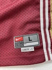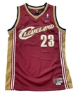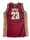 The product is a red Nike sewn jersey of LeBron James, with the number 23, officially licensed by the National Basketball Association (NBA), in size Youth Large. It represents the Cleveland Cavaliers team and is suitable for basketball fans. The jersey is designed for youth and was manufactured in Korea, Republic of.