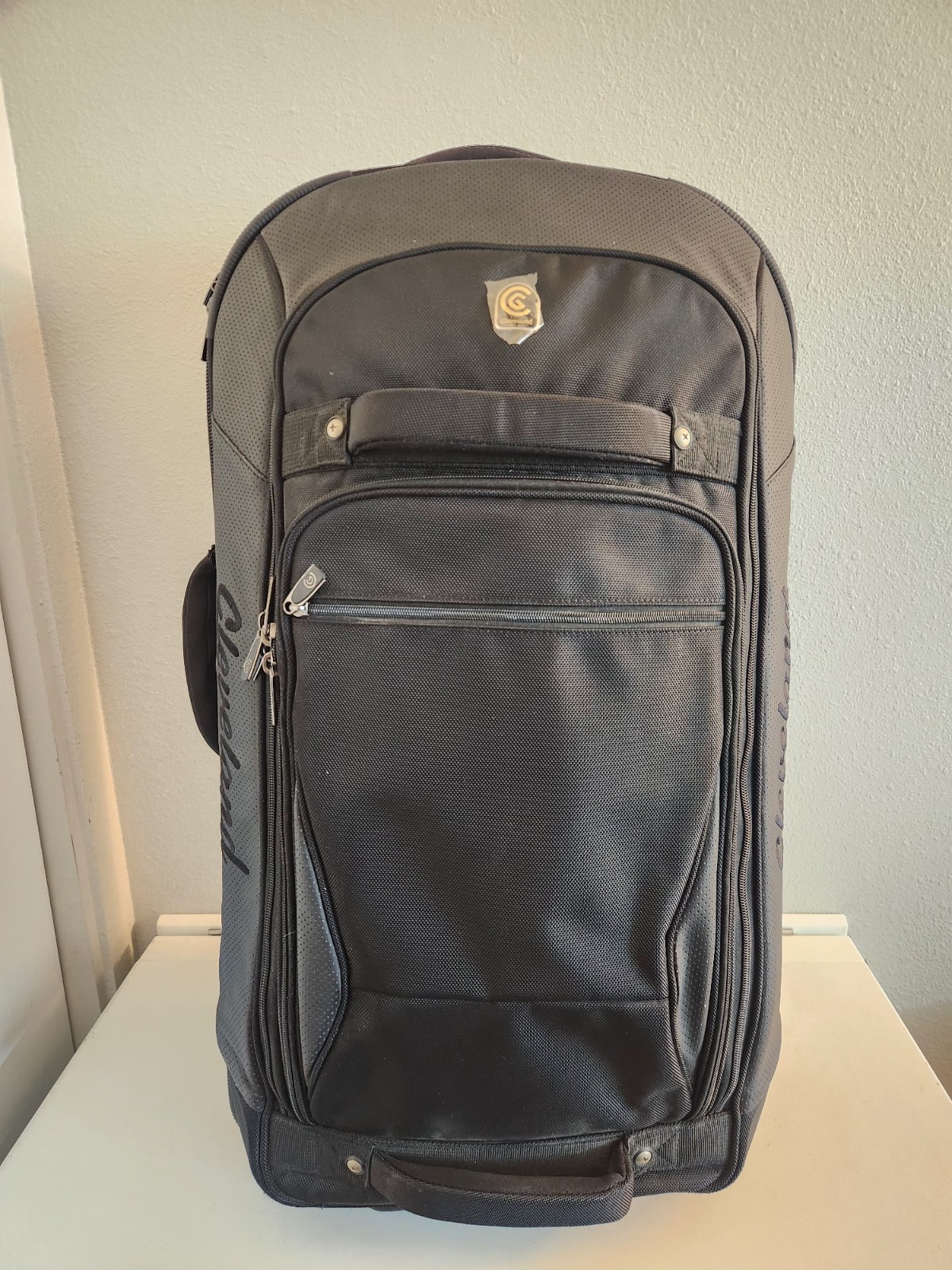 Rare Cleveland Golf Wheeled Suitcase Luggage Bag 29". Ballistic Nylon and leather. New with tags. New with defects. The bag has scratches on the back side from being in storage, see pictures. It was never used. All zippers function properly. No rips or tears. The handle extends and collapses smoothly. Very clean interior. Approximately 29" high 16" wide 12" deep