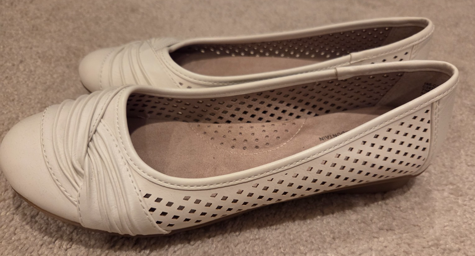 Comfortable and stylish Cliffs by White Mountain women’s flats in size 7.5 , in Excellent Used Condition . These white slip-on flats feature soft pleated detailing across the toe and breathable perforated sides—perfect for work, casual wear, or spring/summer outfits. The insoles are cushioned and very comfortable, with light wear but no major flaws. Features Brand: Cliffs by White Mountain Size: Women’s 7.5 Color: White Condition: Excellent Used Condition – clean, gently worn Style: Slip-on flats Toe Style: Round toe Upper: Faux leather with pleated detail and perforated design Comfort: Cushioned insole Occasion: Casual, work, business casual, daily wear Home: Smoke-free Why You'll Love Them Clean, versatile design Lightweight and comfortable Great for warm weather or office wear EUC — plenty of life left Shipping Ships within 1 business day Carefully packaged