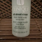 Clinique All About Clean Liquid Facial Soap Extra Mild 6.7 oz - 200 ml NEW! Never used, all about clean liquid facial soap from Clinique. This is the extra-mild variation for very dry to dry skin. Dermatologist-developed, allergy tested and 100% fragrance free. Nourishing, ultra-gentle cream cleanser helps remove pollution and impurities without irritating skin or compromising skins natural moisture balance.