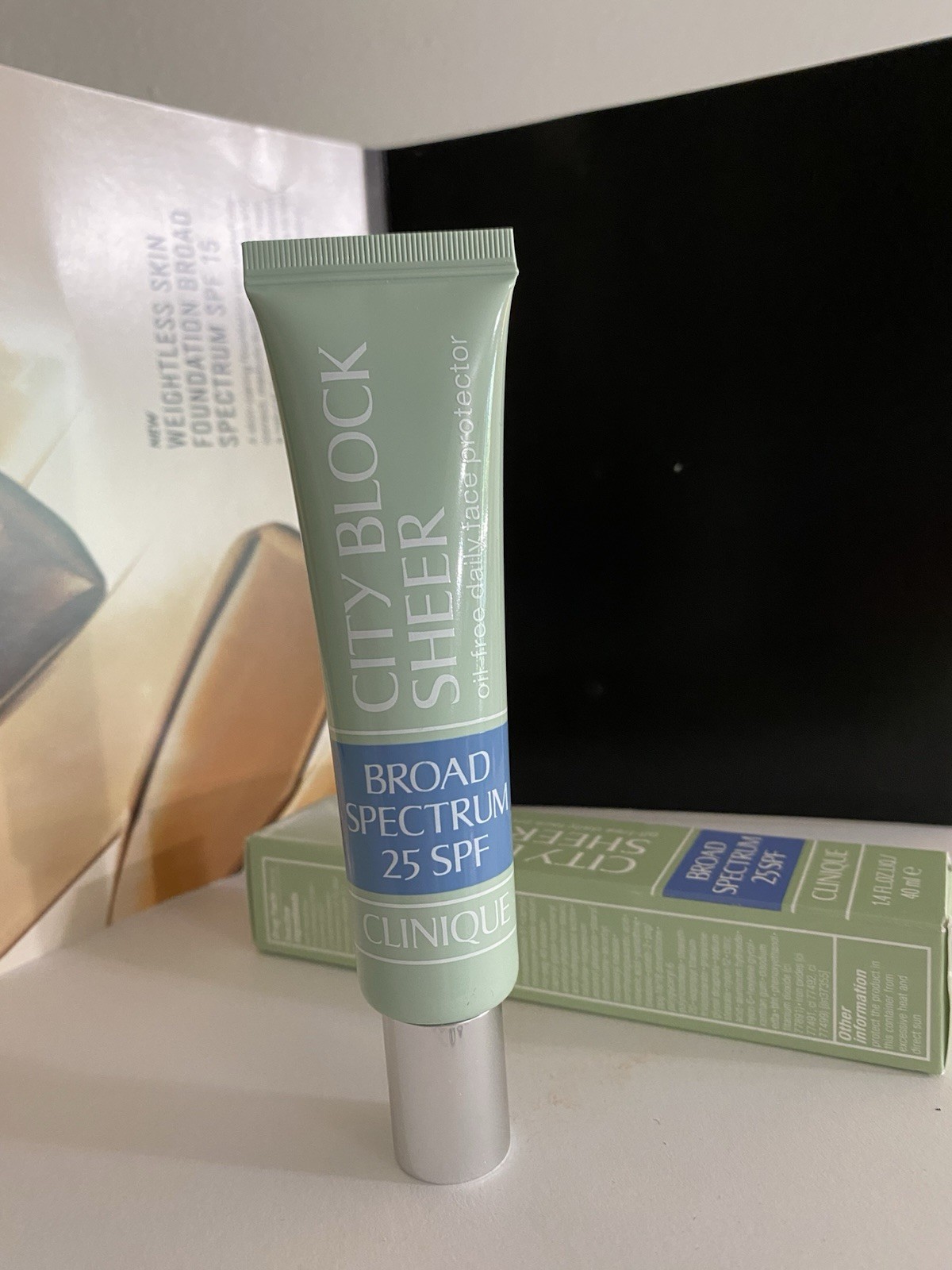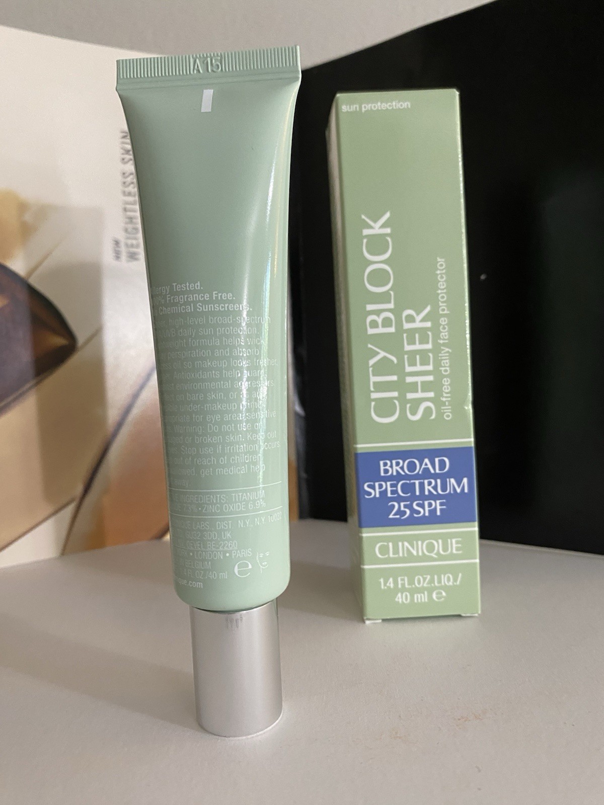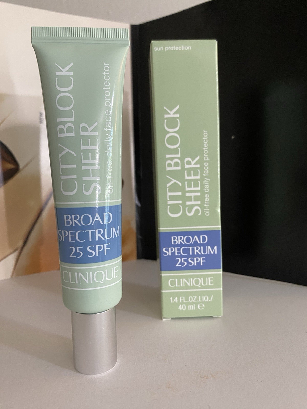 Clinique City Block Sheer Oil-free Daily Face Protector, Broad Spectrum SPF25 Size: 1.4 OZ / 40 ml No chemical sunscreens Sheer, high-level broad-spectrum UVA/UVB daily sun protection. Lightweight formula helps wick away perspiration and absorb excess oil so makeup looks fresher, longer. Appropriate for eye area, sensitive skins