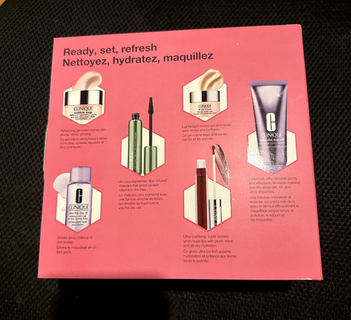 Clinique Ready, Set, Refresh Skincare + Makeup Beauty Gift Set $159 value!. Includes Full Size Take The Day Off Facial Cleansing Mousse (4.2 oz) Full Size Moisture Surge 100H Auto-Replenishing Hydrator Moisturizer (1.7 oz) Full Size Clinique Pop Plush Creamy Lip Gloss in Black Honey Pop (0.11 oz) Full Size High Impact High-Fi Full Volume Mascara in Intense Black (0.27 oz) Take The Day Off Makeup Remover For Lids, Lashes + Lips (1.7 oz) All About Eyes Eye Cream with Vitamin C (0.17 oz)