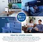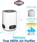 Clorox Air Purifiers for Bedroom Home, True HEPA Up to 200 Sq Ft, White Product Details Color: White Brand: Clorox Home Appliances Product Dimensions: 7.5"D x 7.5"W x 9.5"H Floor Area: 200 Square Feet Specification Met: EPA Certified Noise Level: 23 dB Particle Retention Size: 0.1 Micron Controller Type: Button Control Wattage: 12 watts Manufacturer: Clorox Home Appliances Item Weight: 3.08 pounds Item model number: 11020 Power SourceItem Weight: AC/DC1.4 Kilograms Control MethodFilter Type: TouchPre-Filter CAPTURES 99.97% OF ALLERGENS AND PARTICULATES AND REDUCES VIRUSES AND BACTERIA. The Clorox Tabletop Air Purifier has True HEPA filtration to capture 99.97% of particles as small as 0.1 microns and a pre filter to capture larger particles. 2 STAGE 360° FILTER: Delivers 360° air purification by capturing allergens and particulates in 2 filter layers. The outside pre filter catches large dust particles and pet hair and the True HEPA filter captures 99.97% of allergens and particulates. IDEAL FOR SMALLER ROOMS. This compact air cleaner is perfect for smaller rooms like the office, dorm, bedroom, den or nursery. The 360° filter pulls in air from all directions to clean rooms up to 5 times per hour when used in a room 80 sq. ft. and 2 times an hour when used in a room up to 200 sq. ft. EASILY CUSTOMIZE TO ANY ROOM OR SCHEDULE: This True HEPA air purifier has 3 speeds to let you customize air care to your needs. The optional timer lets you set air cleaning to your schedule simply choose from 8, 4 or 2 hours of operation. WHISPER QUIET SETTING IS PERFECT AT NIGHT. Get ready for a good night's sleep. Select the low speed for quiet air purification and turn the adjustable night light to bright, dim or off. GENUINE CLOROX FILTERS: Replace the filter every 6 12 months by searching for B09N54QY1R or Clorox 12020 Tabletop Replacement Filter. Maintain optimal performance with True HEPA filtration to capture 99.97% of particles as small as 0.1 microns and a pre filter to capture larger particles.at enter the True HEPA filter. 99.97% effective in capturing particles as small as 0.1 microns that enter the true HEPA filter. Reduction of viruses and bacteria as air passes through the true HEPA filter. Actual % of reduction varies. Does not kill viruses or bacteria. Cleaning effectiveness and filter life vary by air quality. Based on independent CADR testing, when operating on highest fan speed. Suggested room sizes assumes closed room with 8 ft. ceiling Estimated costs assumes usage on the highest fan speed, 24 hours a day, 365 days a year. Average utility rate of $0.12 per KWh. For more information about energy consumption, visit energy.gov Before first use remove Power Adapter from inside the filter. See Use and Care guide for more information. Testing performed by independent third party, LMS Technologies, INC, January 1, 2022 The Clorox™ Tabletop Air Purifier captures 99.97%* of particulates as small as 0.1 microns and reduces viruses and bacteria** so you can breathe easier. The 2 stage 360° filter captures particulates in a pre-filter and True HEPA filter. * Before first use remove Power Adapter from inside the filter. See Use and Care guide for more information.