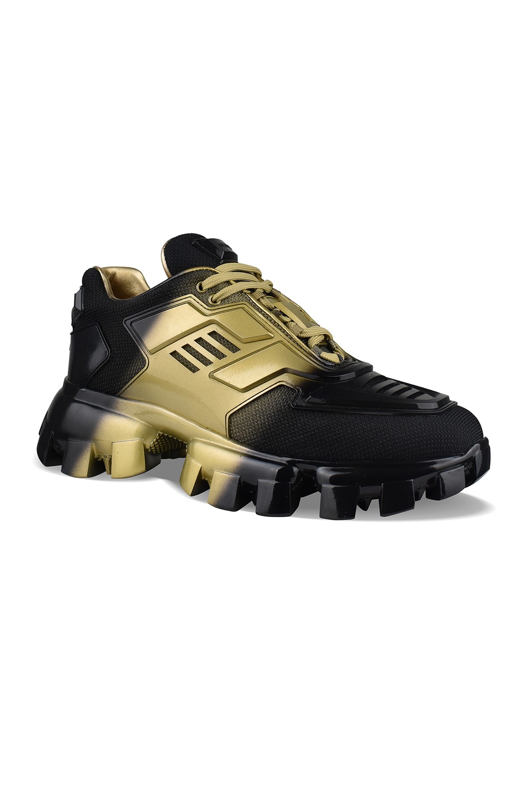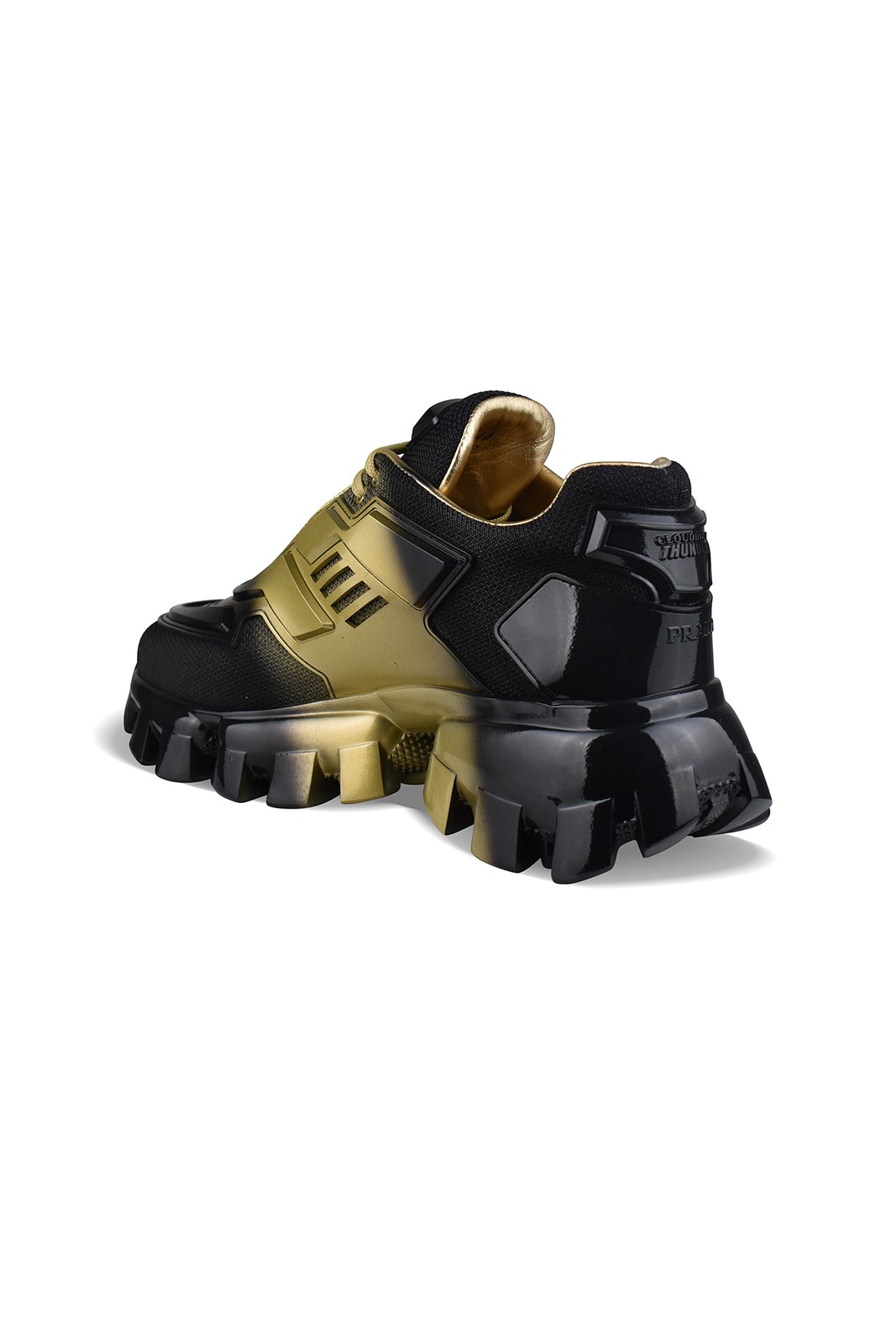 Cloudbust Thunder Sneakers Cloudbust Thunder Prada sneakers black and gold. Textile and rubber panel design. Rubber logo on tongue and back. Lace-up closure. Bulky rubber sole. Made in Italy. Prestalia e-commerce solutions.