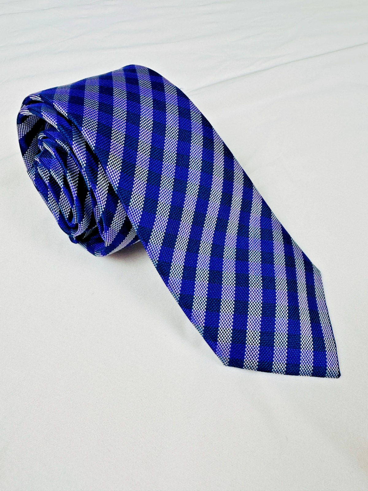Add a polished pop of color to your wardrobe with this Club Room men’s necktie , featuring a timeless purple, navy, and silver check/plaid pattern . The classic diagonal check design works equally well for business, weddings, church, or everyday professional wear. Crafted from 100% silk , this tie has a smooth texture with a subtle sheen, offering a refined look without being flashy. The versatile color palette pairs easily with navy, gray, or black suits and crisp white or lavender shirts. This tie is new without tags and in excellent condition . 📌 Key Details Brand: Club Room Style: Classic / Business / Dress Pattern: Check / Plaid Colors: Purple, Navy Blue, Silver Material: 100% Silk Width: Standard width (approx. 3.25–3.5") Length: Approx. 57–58" (see photos for measurement) Care: Dry Clean Only Made In: China 👔 Perfect For Office & business wear Interviews Weddings & formal events Gifts for professionals Purple-themed or patterned tie collections