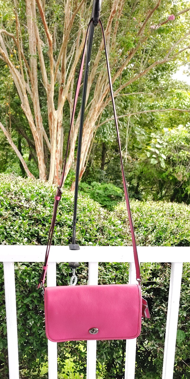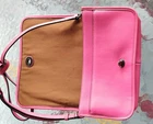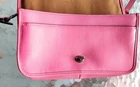 Coach 1941 Dinky 38015 Bubble Gum Pink Leather Turn Lock Crossbody Brand: Coach Style Name/Number: 1941 Dinky Turn Lock Crossbody / 38015 Color: Bubble Gum Pink Material: Leather Hardware: Gunmetal-tone Handles/Strap: Leather crossbody strap Closure: Flap with turn lock Interior: Leather and fabric lining with slip and kisslock pockets Measurements: - Length: 9" - Height: 5" - Width: 2" - Strap Drop: 22" Features: - Iconic Dinky silhouette - Compact design for essentials - Durable leather construction - Gunmetal-tone hardware accents Condition: - Previously owned - Scuffs on exterior leather surfaces - See all photos for detailed condition Note: - Please look carefully at all photos as they are part of the description - Ask all questions before buying
