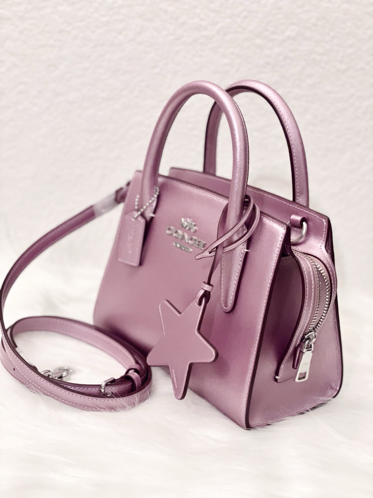 Coach Andrea Carryall Bag CW024 Confidence to shop! Guaranteed Authentic ~ Purchased directly from Coach! Brand new with tags Color: Metallic Pink Product Details Style Number CW024 Measurements Length: 8.75" Height: 6.5" Width: 4.5" Materials Pearlized smooth leather Fabric lining Handle Handles with 3.25" drop Strap Detachable strap with 21.75" drop for shoulder or crossbody wear Features Inside multifunction pocket Zip closure Four protective feet at base Price is firm