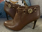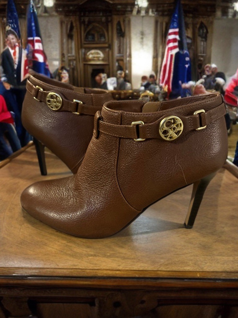 These Coach ankle boots in size 6 are new without the box, making them a great addition to any woman's wardrobe. The brown leather boots feature a high block heel, perfect for adding a touch of sophistication to a casual outfit. With a classic bootie style and leather lining and insole, these boots are both stylish and comfortable for all-day wear. Perfect for the winter season, these Coach boots are a must-have for any fashion-forward woman. Great deal! Beautiful boots! No flaws that I can see!! These particular boots have been traipsing all over creation posing for pictures! This is a steal of a deal at 75 dollars! MSRP is $248.00! Beautiful boots! Mr. Parker