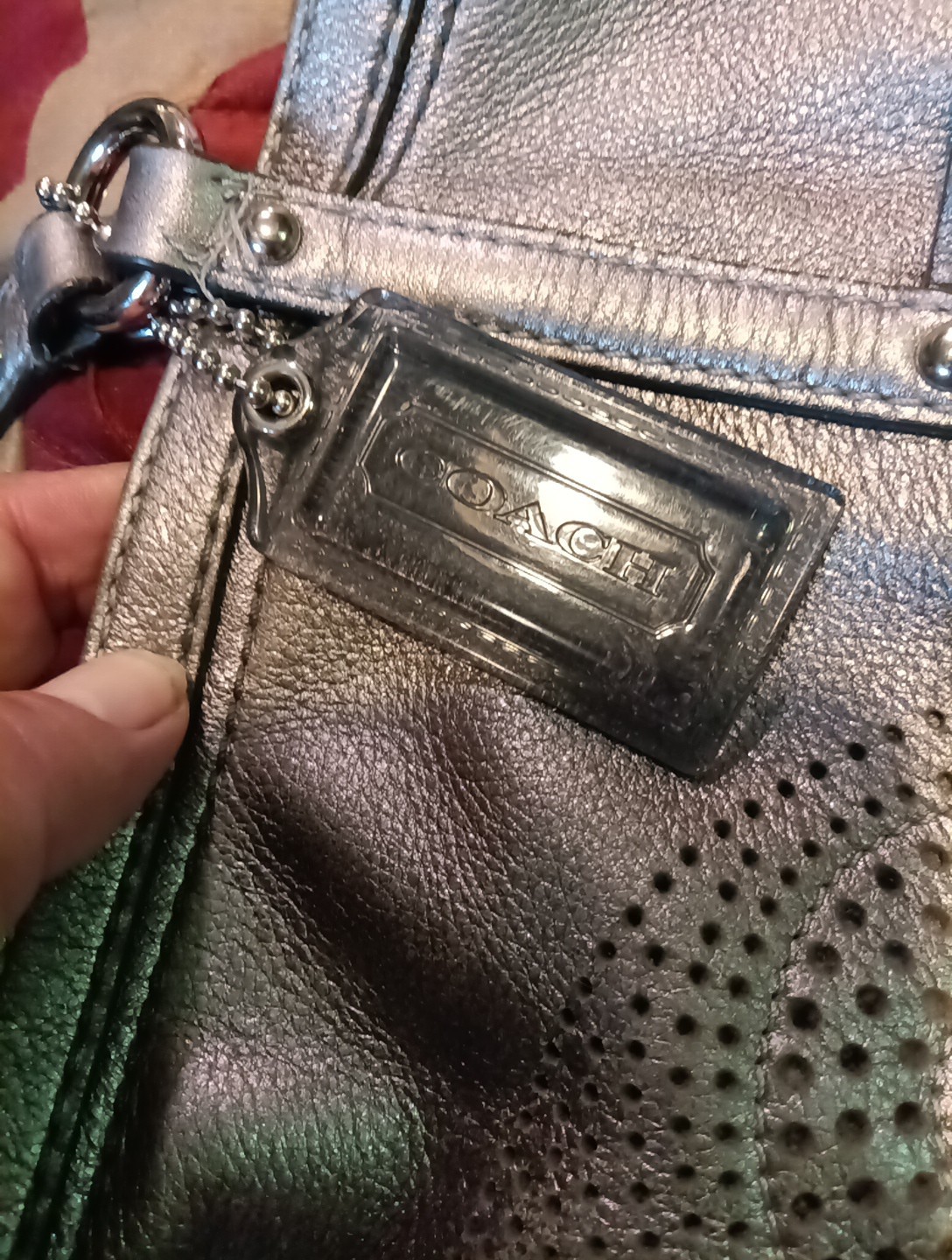 This stunning silver metallic tote is a total showstopper! The leather has a luxe sheen that catches the light beautifully, and the cinched detailing adds such a chic touch. Despite being pre-owned, it's in fantastic shape—just some faint marks inside and light wear that give it character. The handles are sturdy and look brand new. Perfect size for daily essentials, and the north-south silhouette keeps everything organized. Goes with everything from jeans to dresses—an effortless way to elevate any outfit. Love how lightweight yet durable it feels! Coach quality shines through.