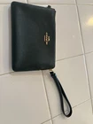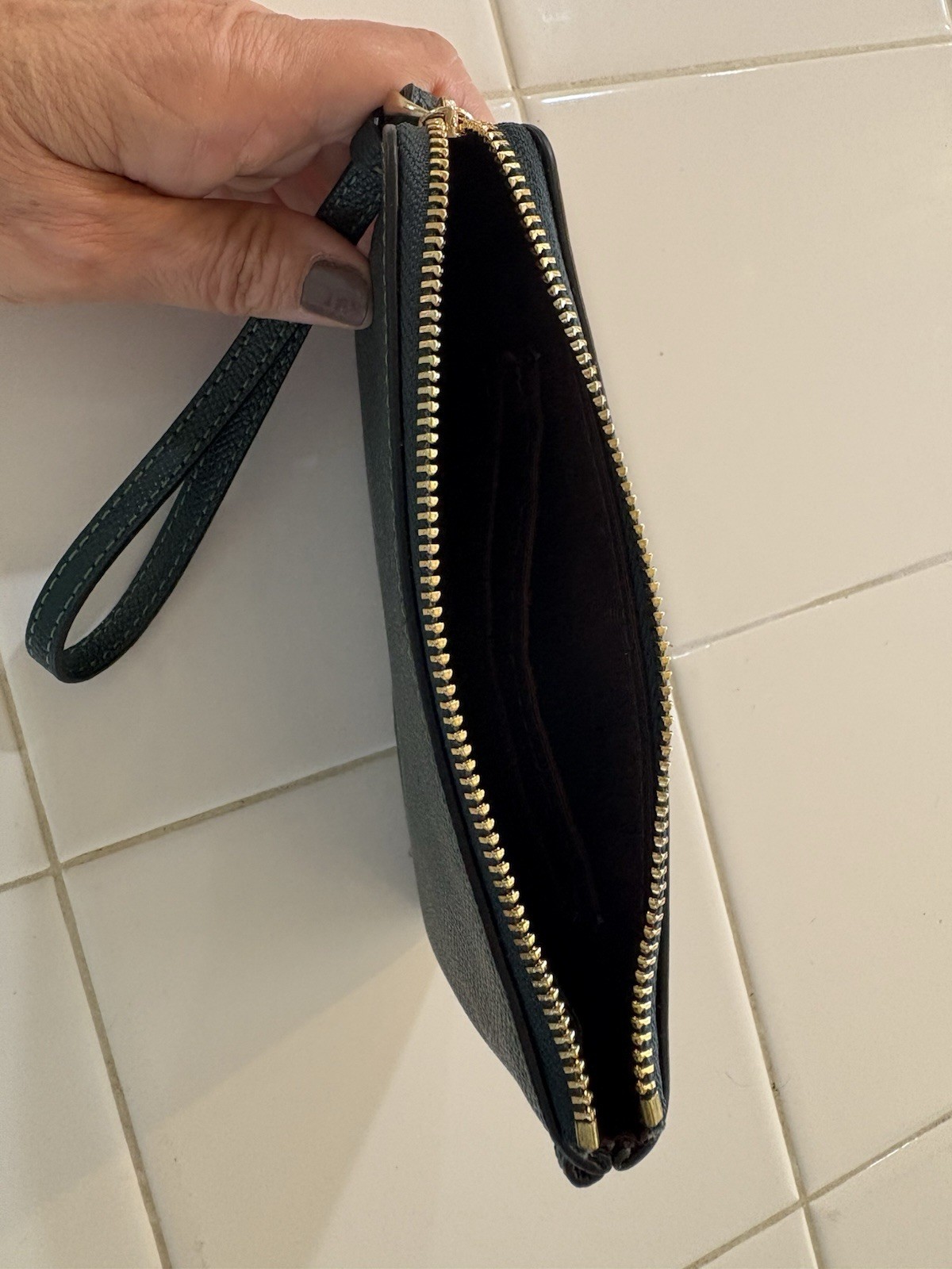 Dark green Coach wristlet with gold zipper and brown interior. Never used, brand new. No original tags.