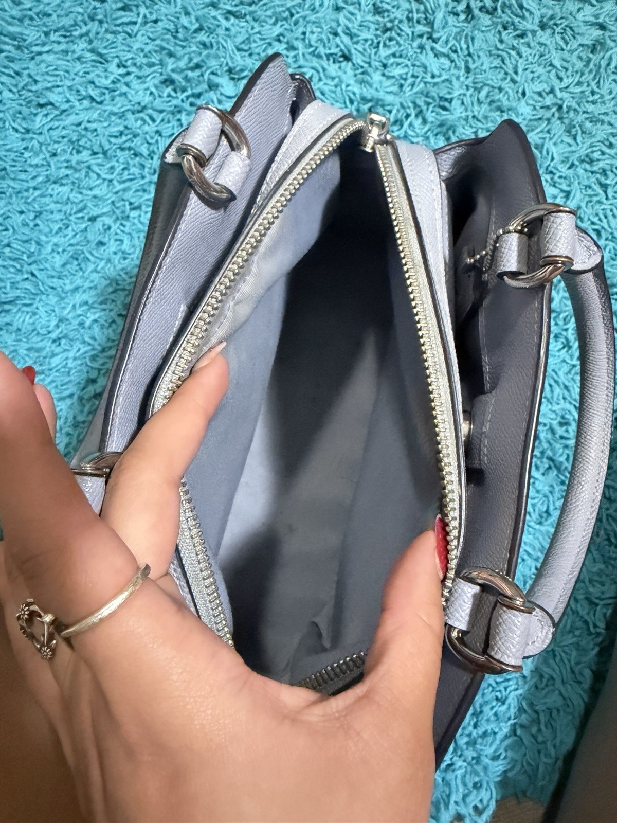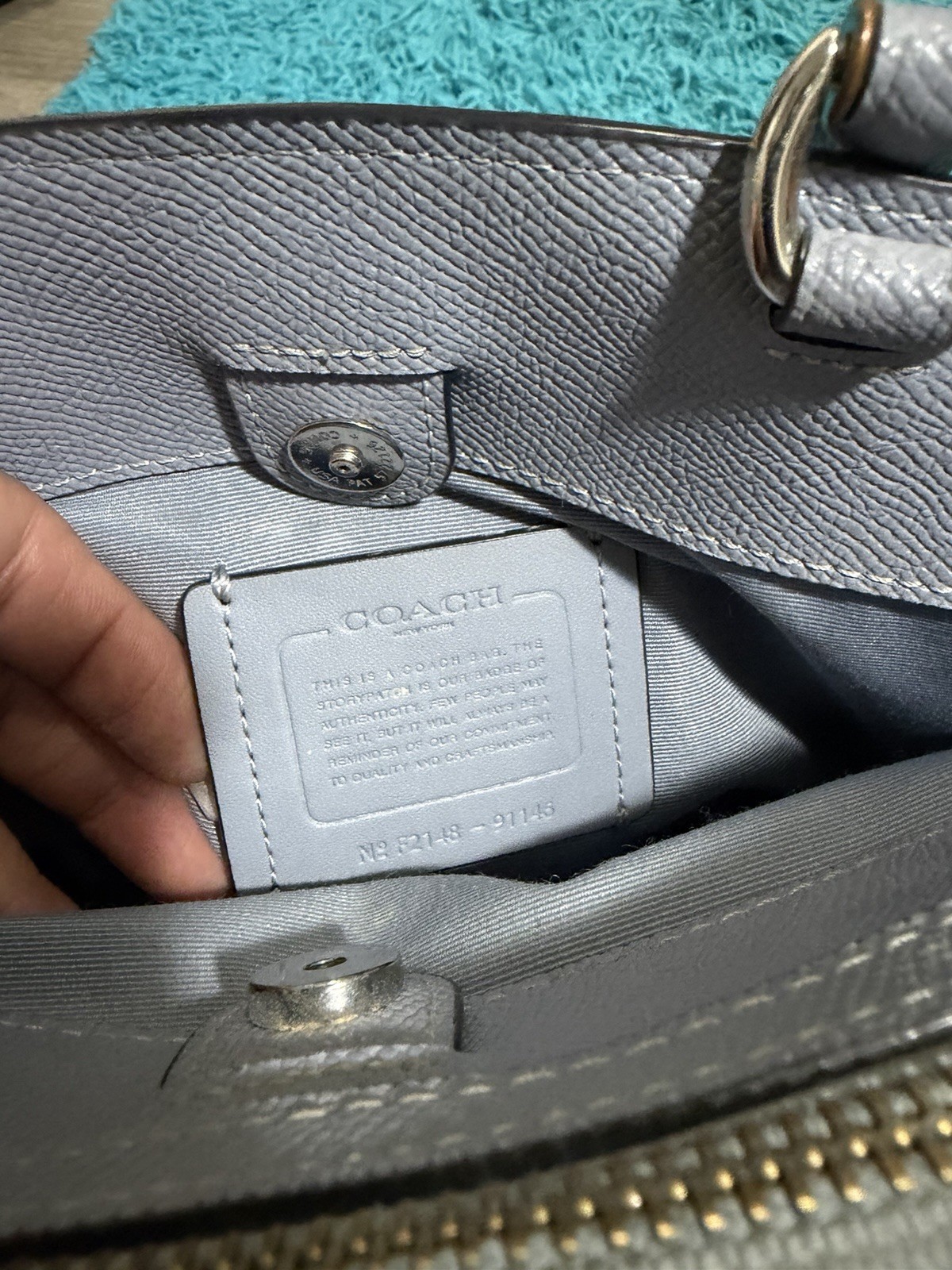 The Coach Baby Blue Leather Handbag Purse is a stylish and chic accessory perfect for women looking for a designer touch. Made from high-quality leather with a pebbled finish, this small crossbody bag features a solid blue exterior with silver hardware accents. The purse includes inner pockets for organization and a zip closure for security. The blue leather handle/strap adds a pop of color to the overall look, making it a versatile piece that can elevate any outfit. Additionally, the bag charm adds a fun and personalized touch to this fashionable Coach handbag.