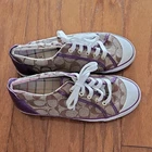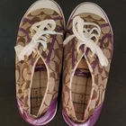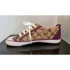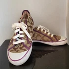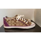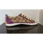 Pre-owned Coach Barrett tennis shoes in women's Size 8B. Stylish Signature pattern with purple accents. Comfortable and cute! Great pair for back to school! Please review all pictures prior to purchase as they are part of the description. Add these sneakers to your wardrobe today!