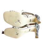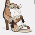 Western inspiration to dressy looks in Coach's strappy Bella dress sandals boasting whip-stitch details, tassels and ornamental hardware. Leather (Snakeskin) Heel 3 1/3" - Size 5.5 - Color: Caulk/Natural - NWOB. Some sticker residue. X mark on the soles. See photos - Smoke and pet free home Size: 5.5
